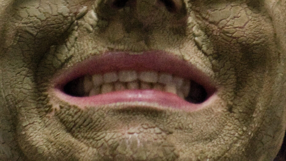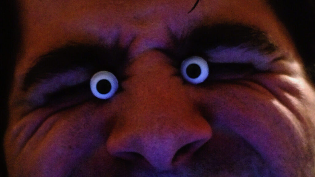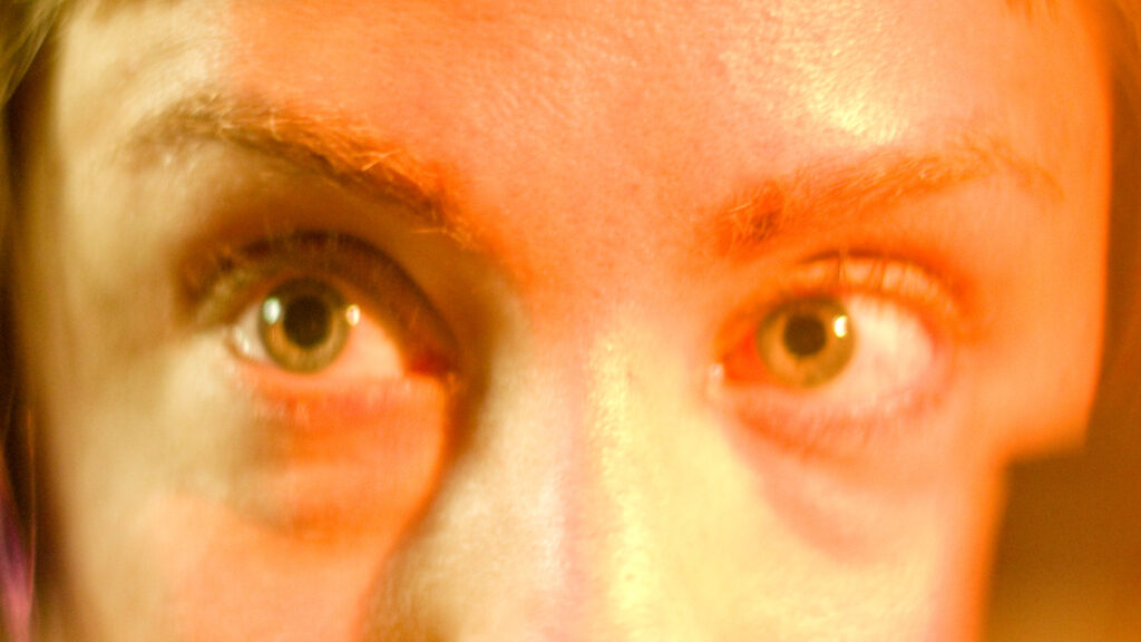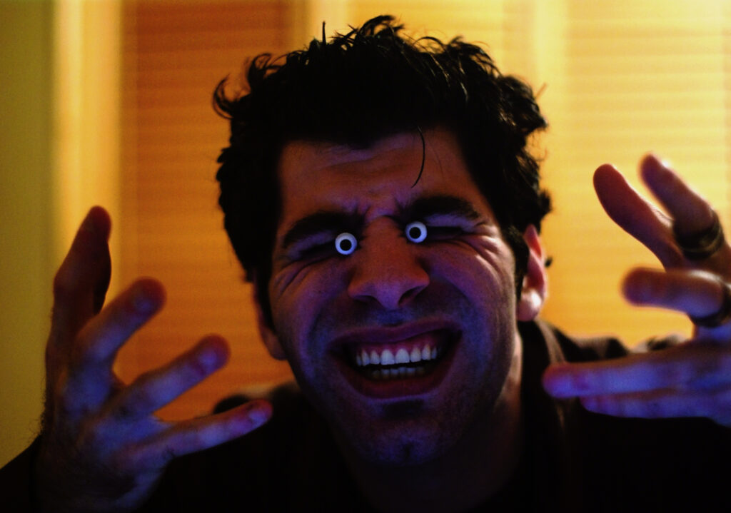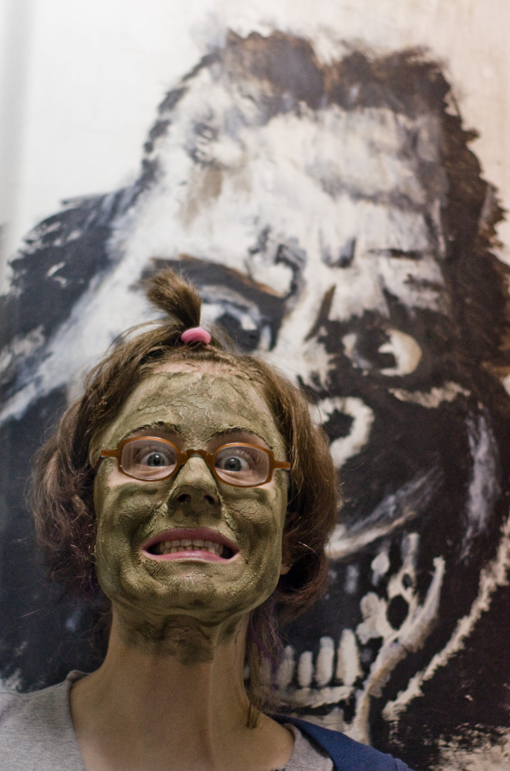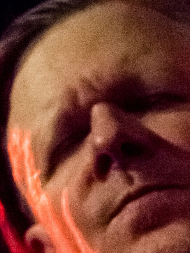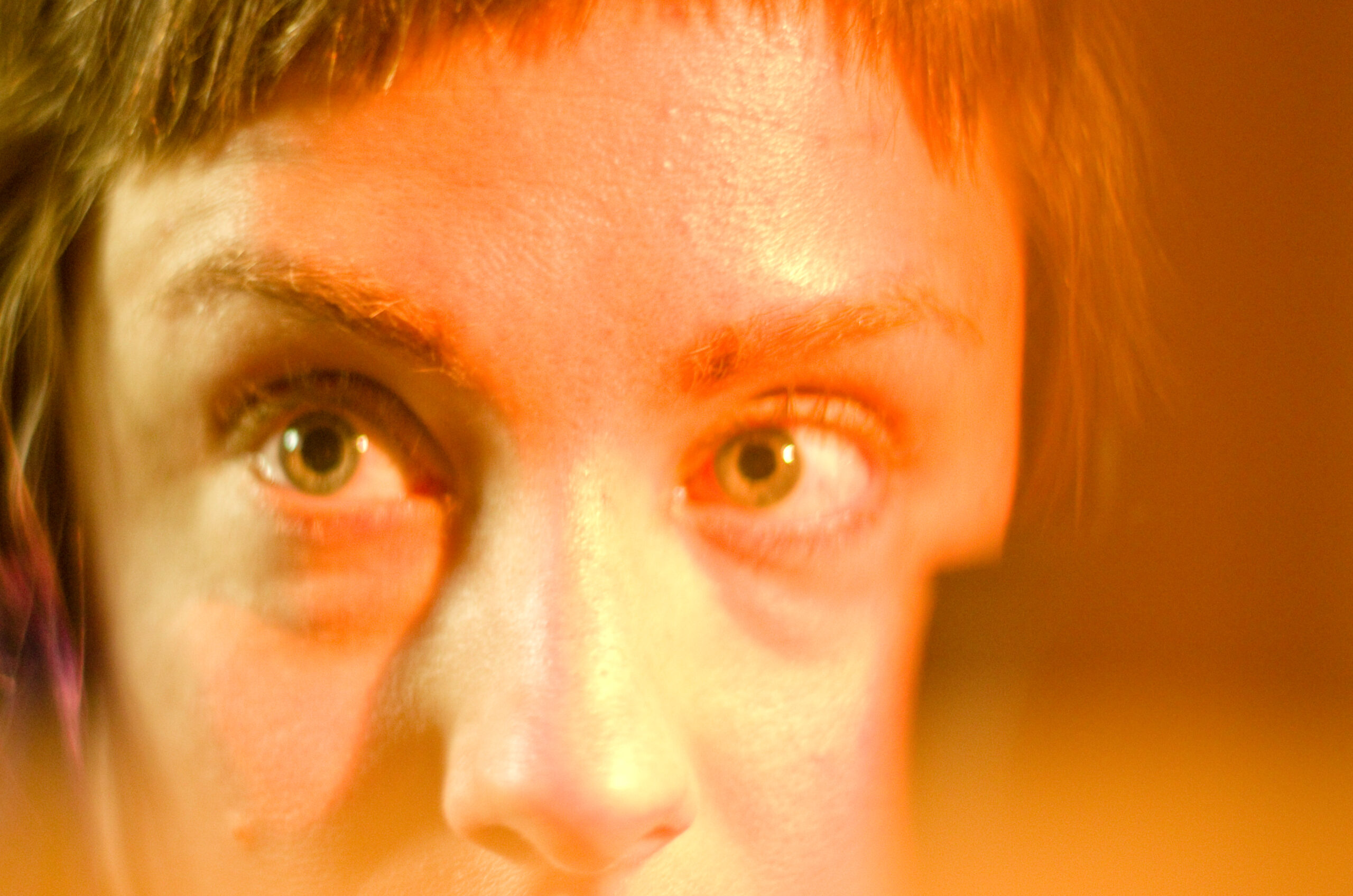 King Kong nostrils, green face, camera holding hands, golden eyes, dippy hair, no eyebrows like purple haired me. Bright orange like Michael Gira’s stage lighting.