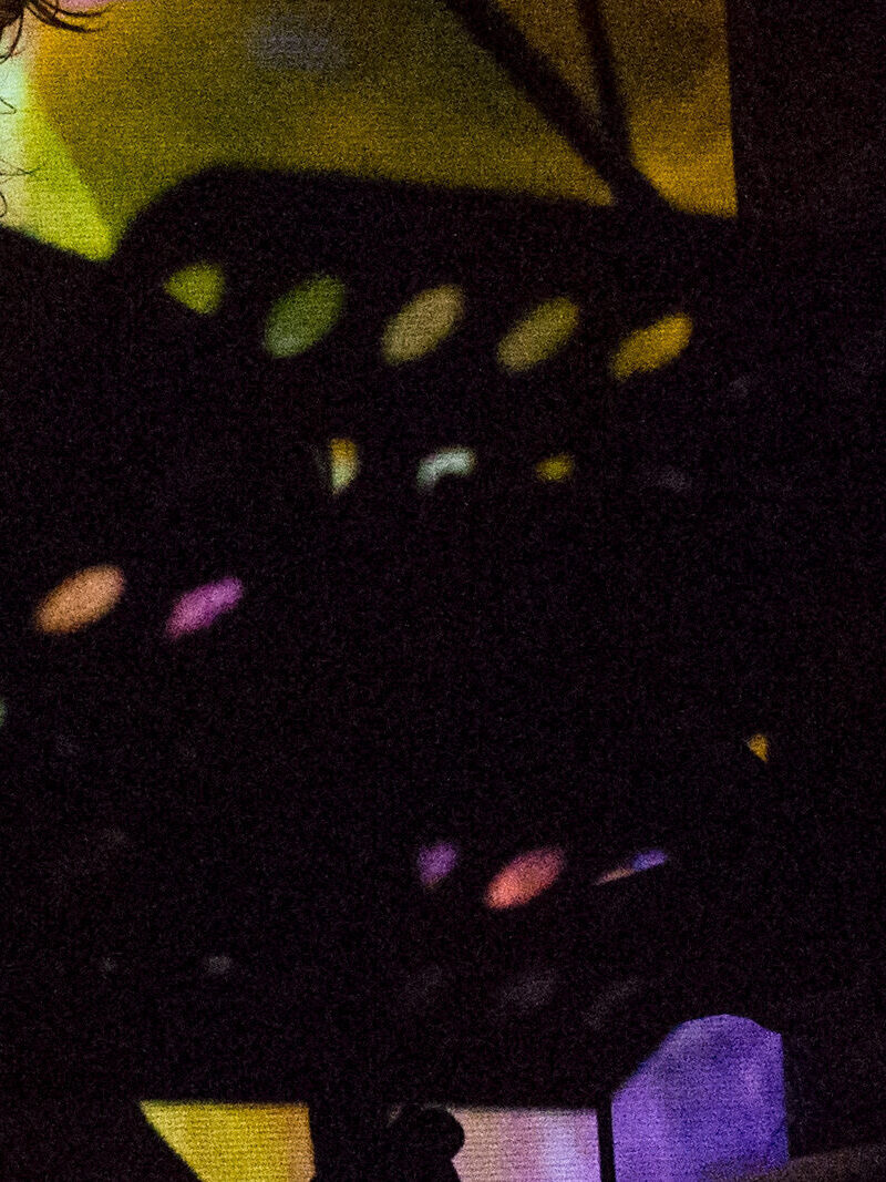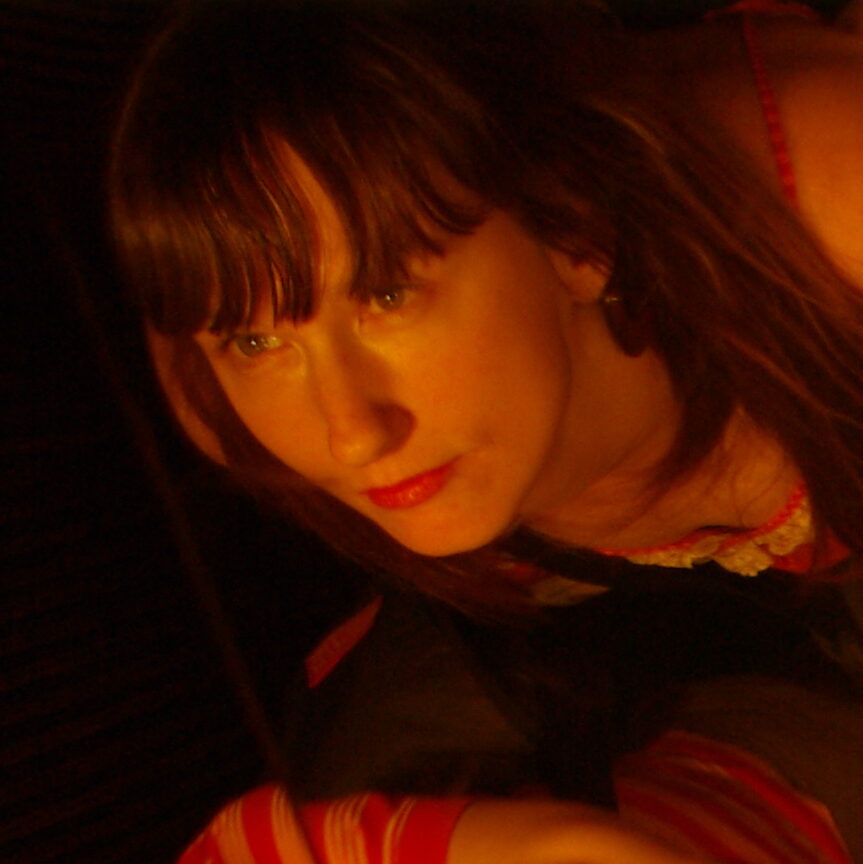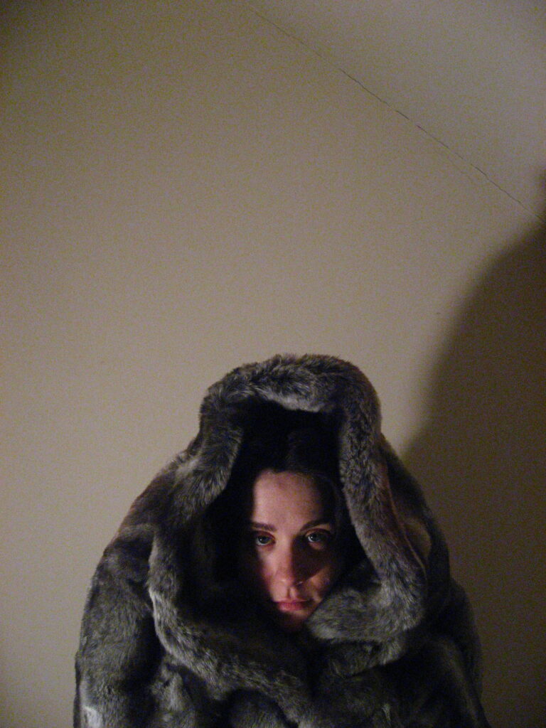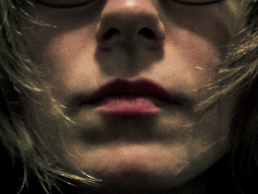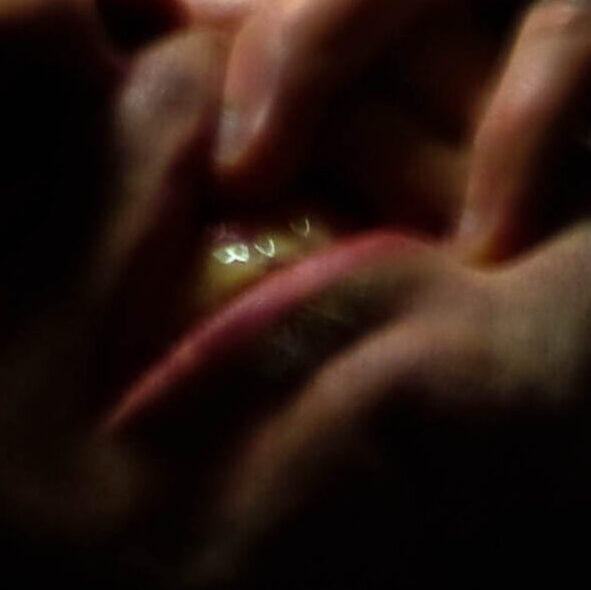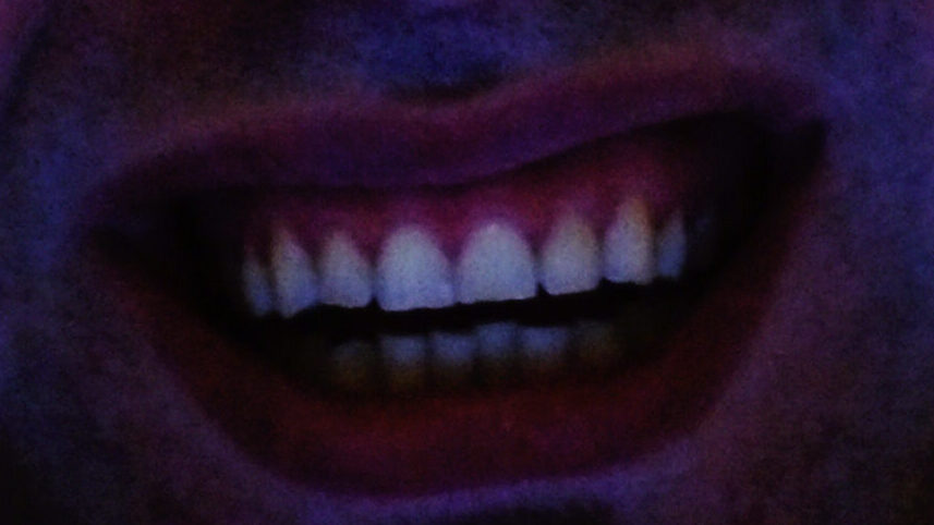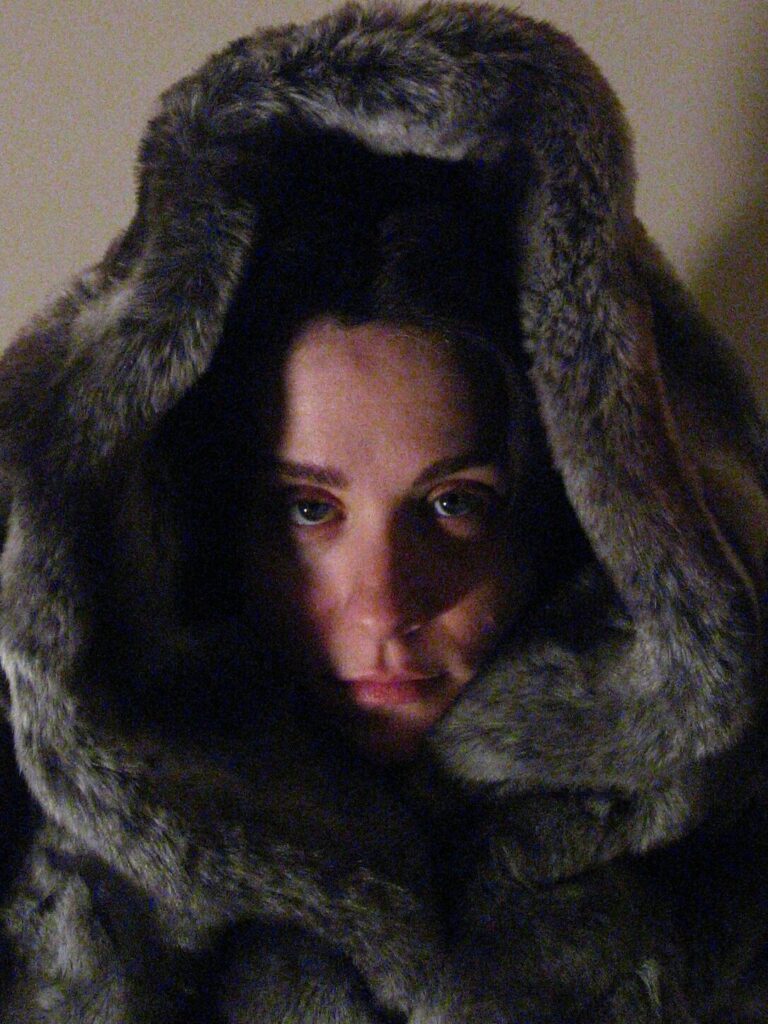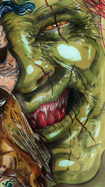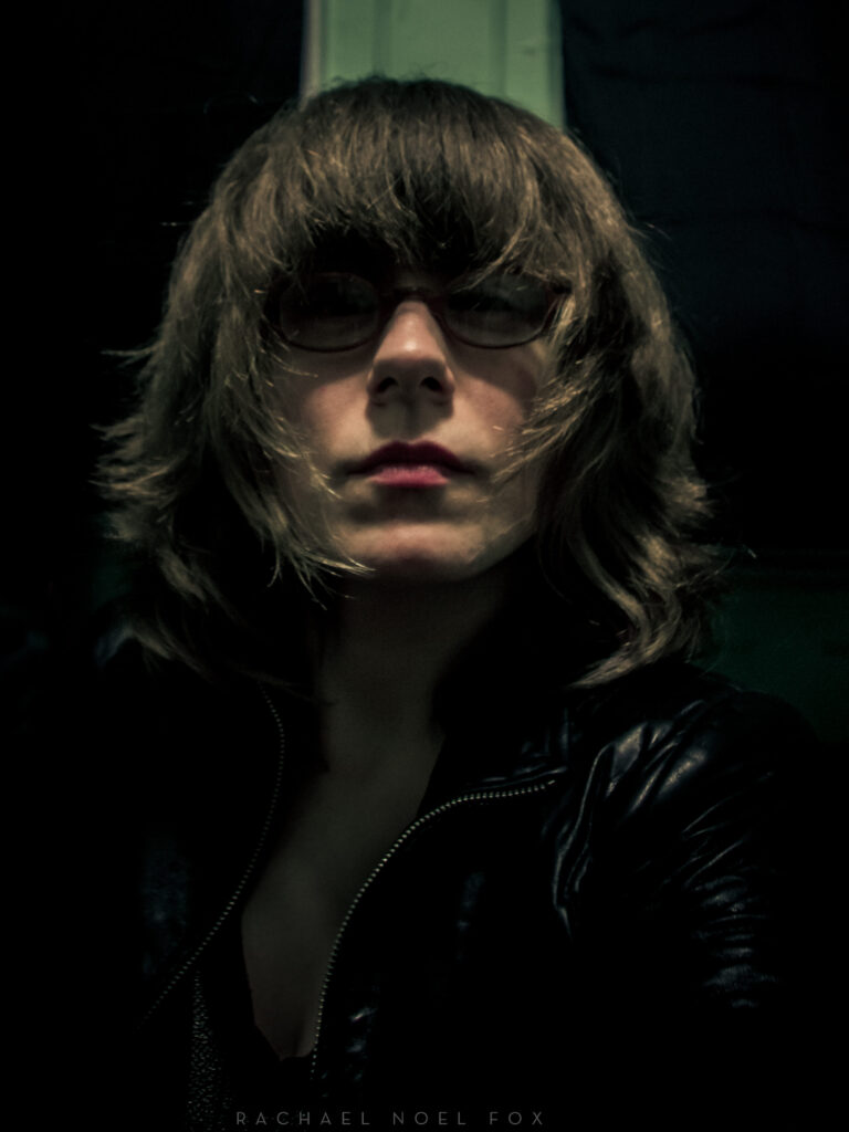 King Kong nostrils, green face, camera holding hands, golden eyes, dippy hair, no eyebrows like purple haired me. Bright orange like Michael Gira’s stage lighting.