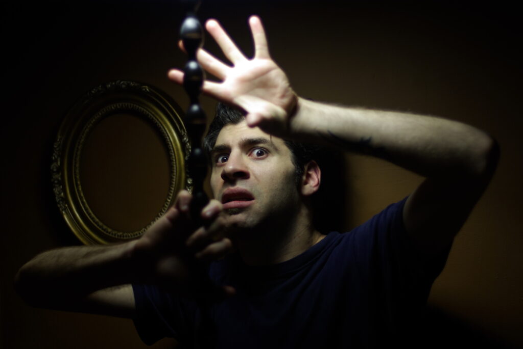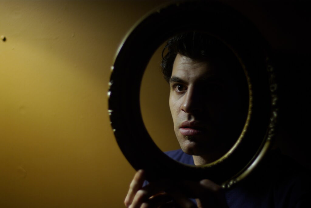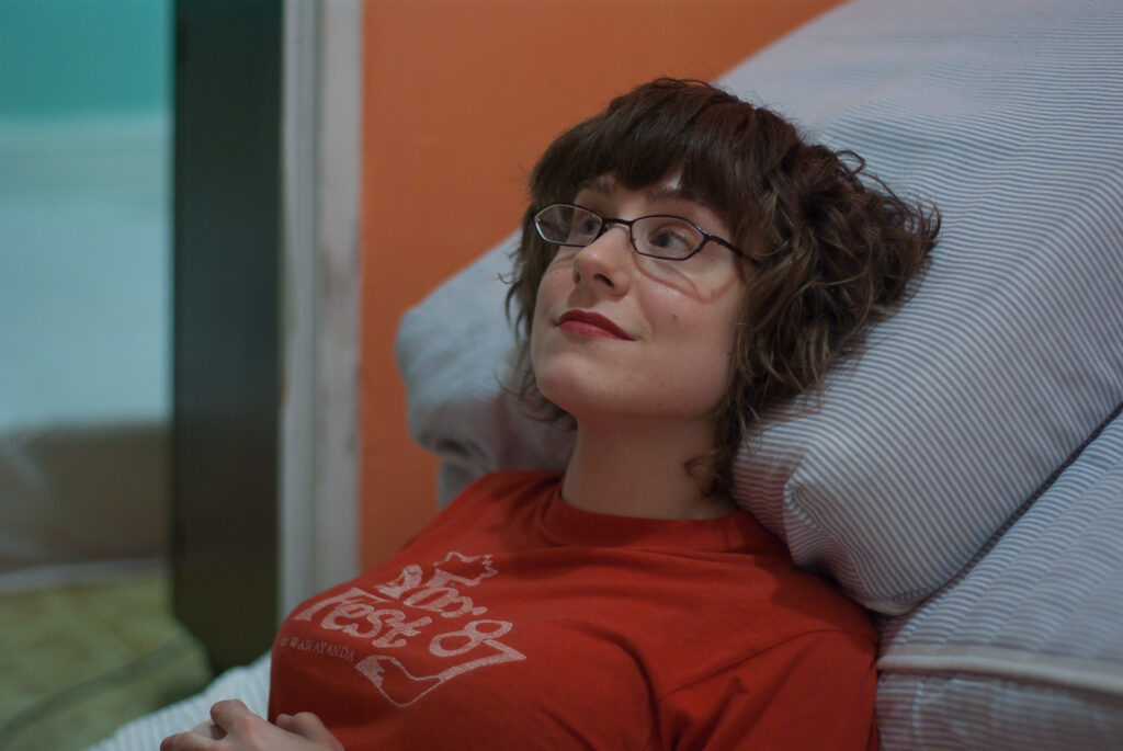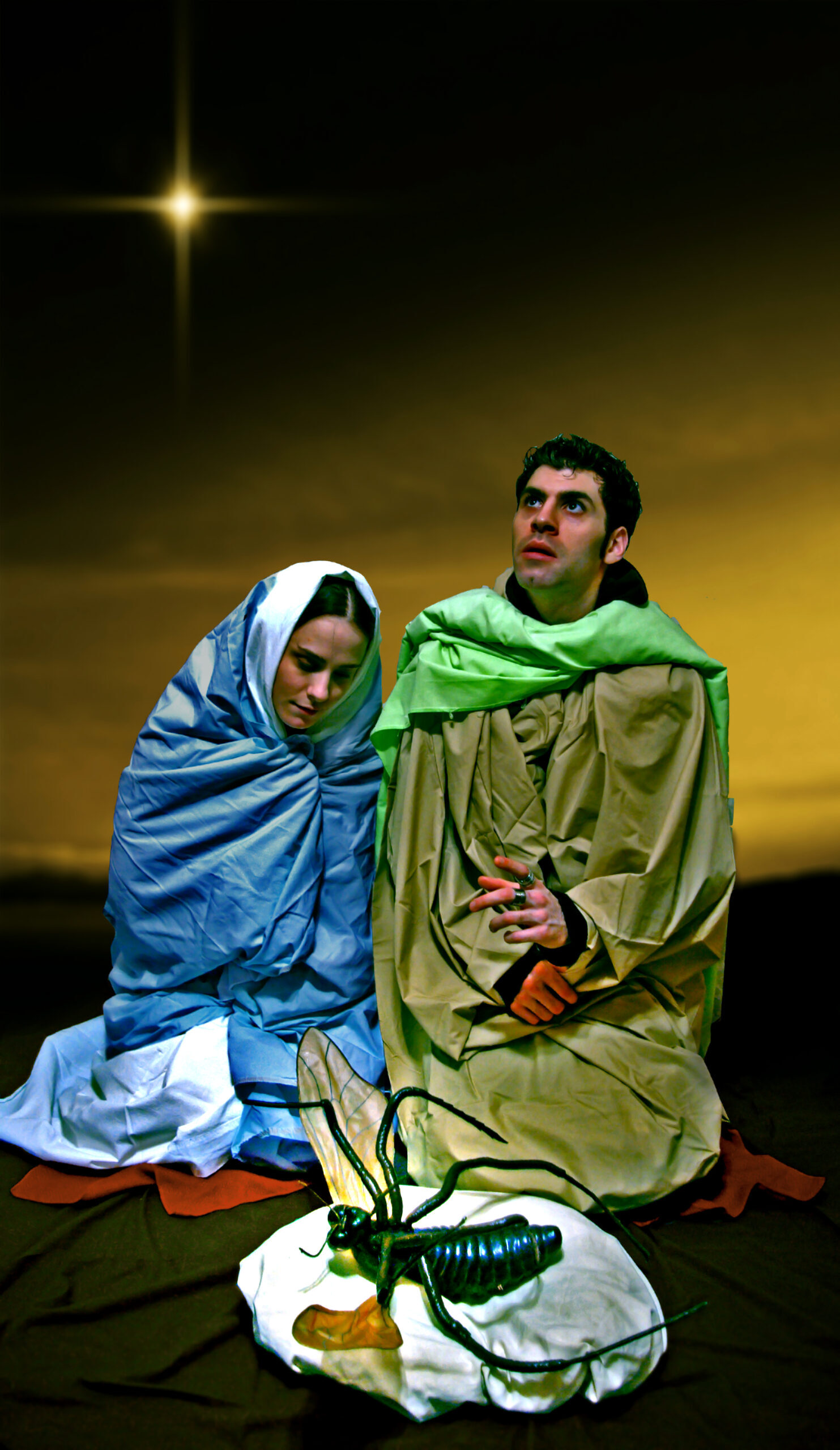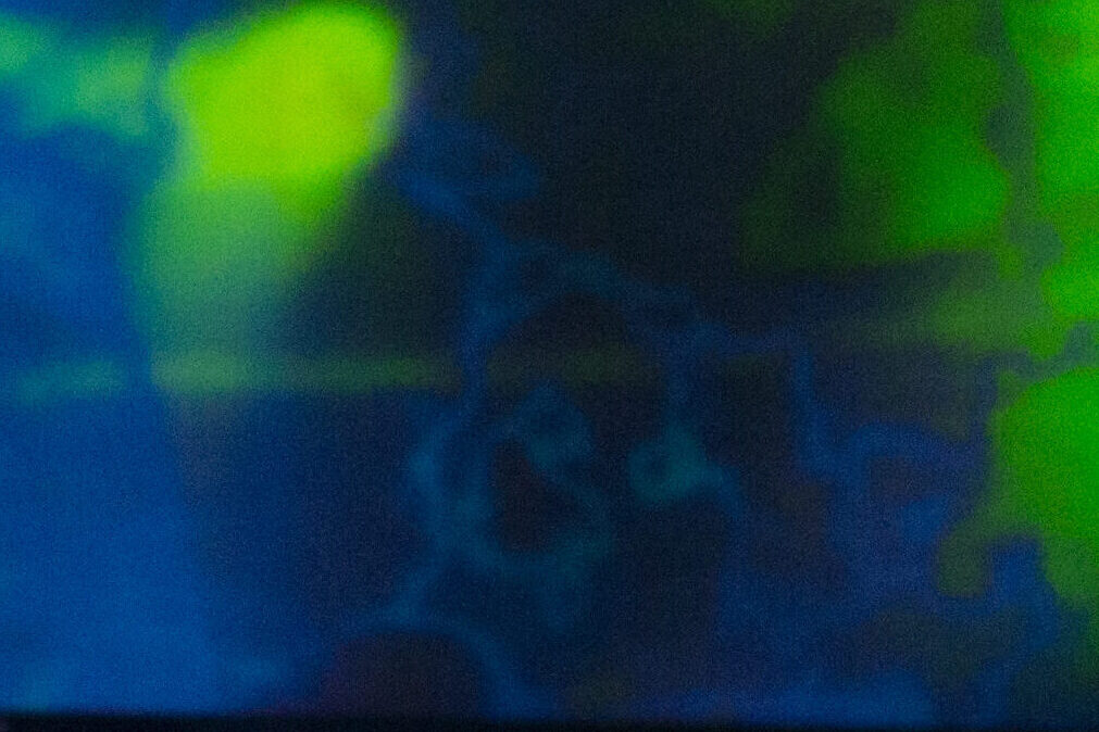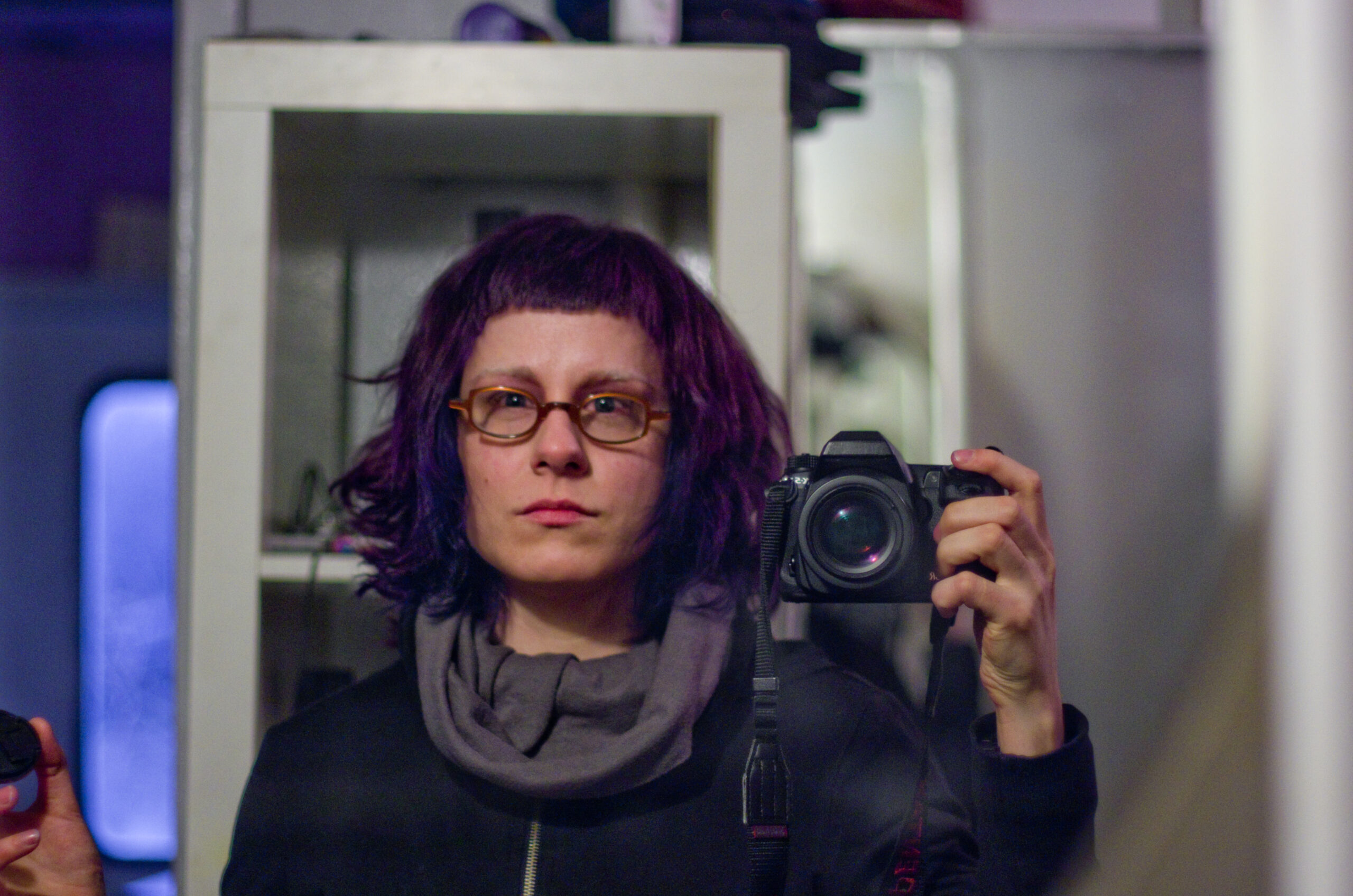 King Kong nostrils, green face, camera holding hands, golden eyes, dippy hair, no eyebrows like purple haired me. Bright orange like Michael Gira’s stage lighting.