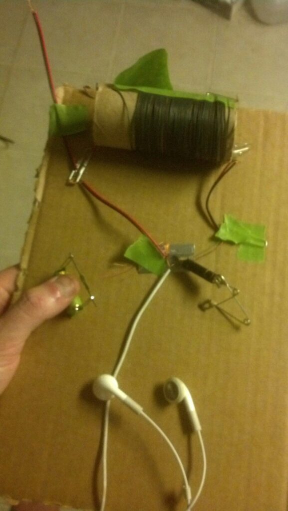 “Couldn’t sleep….so I grabbed some miscellaneous garbage and made a working radio. It only gets one talk radio station….but no batteries required. Cool huh? :::crickets:::”