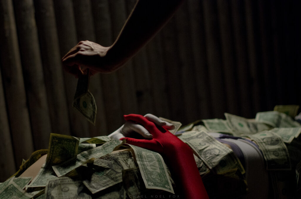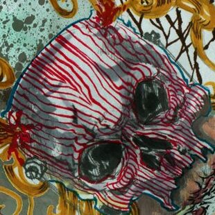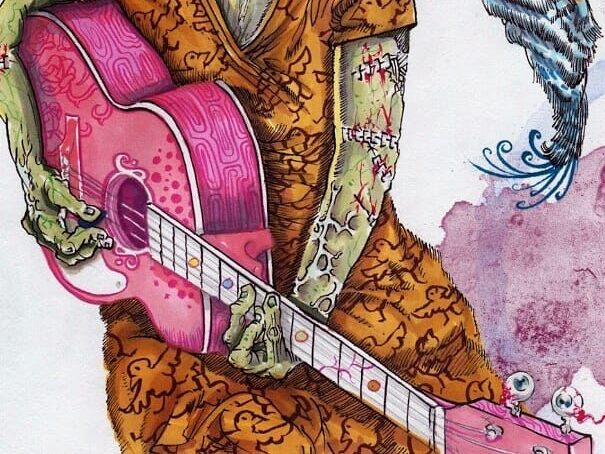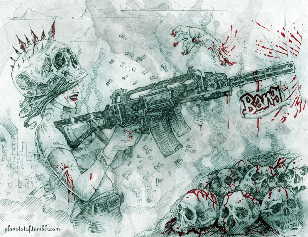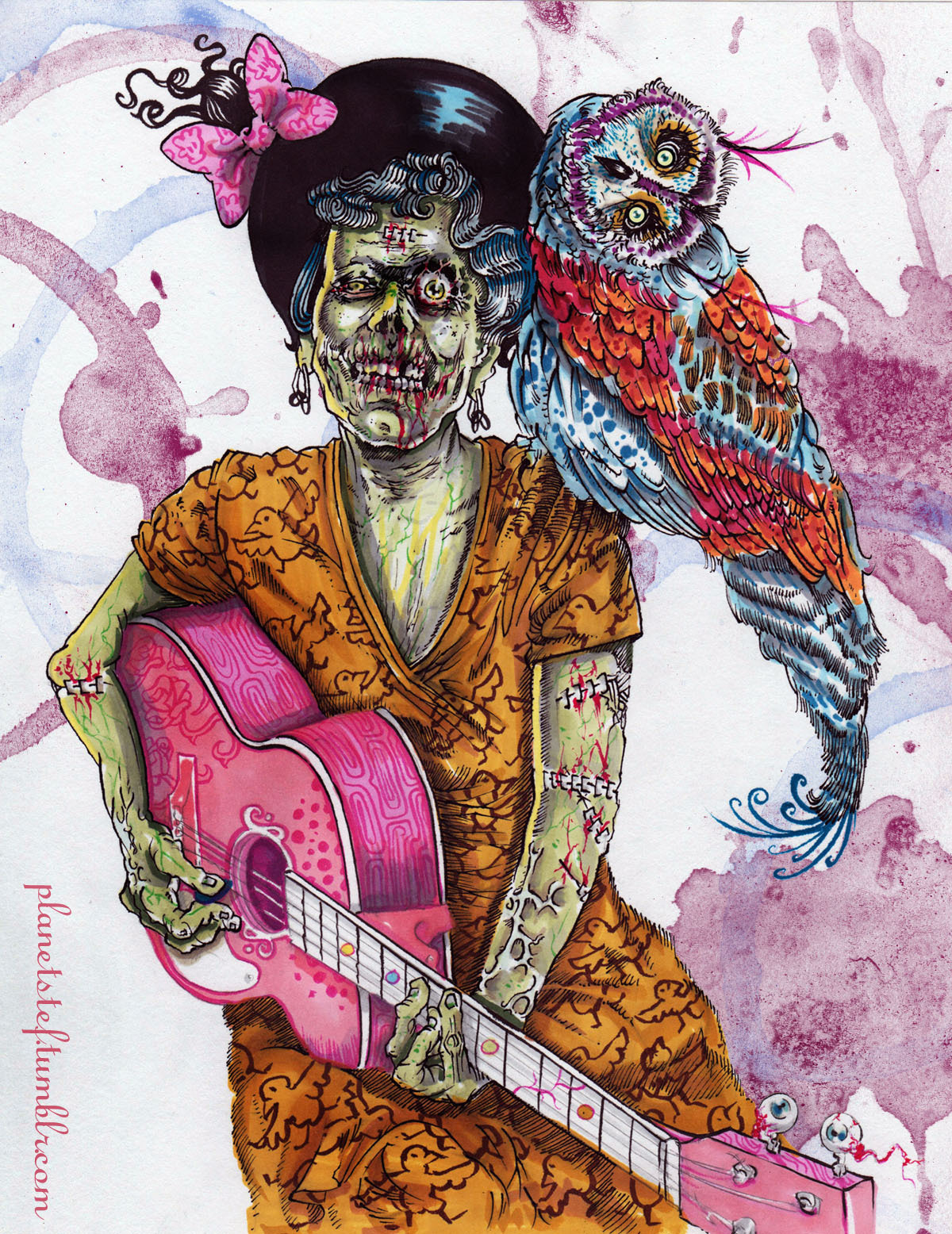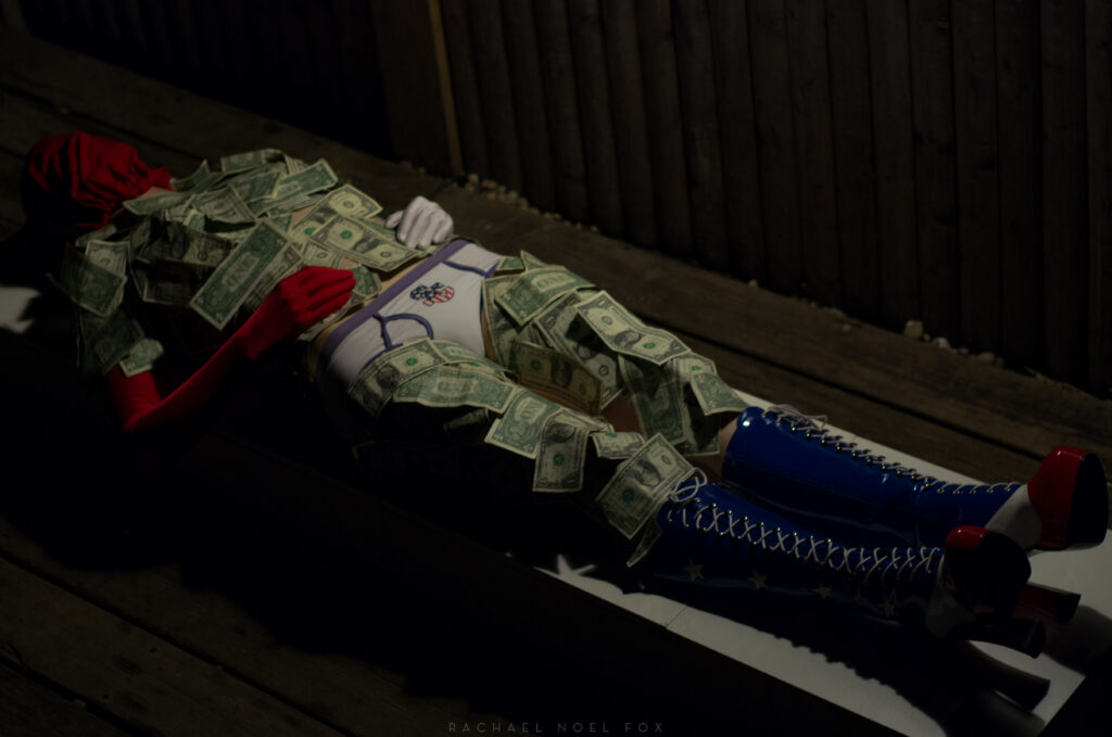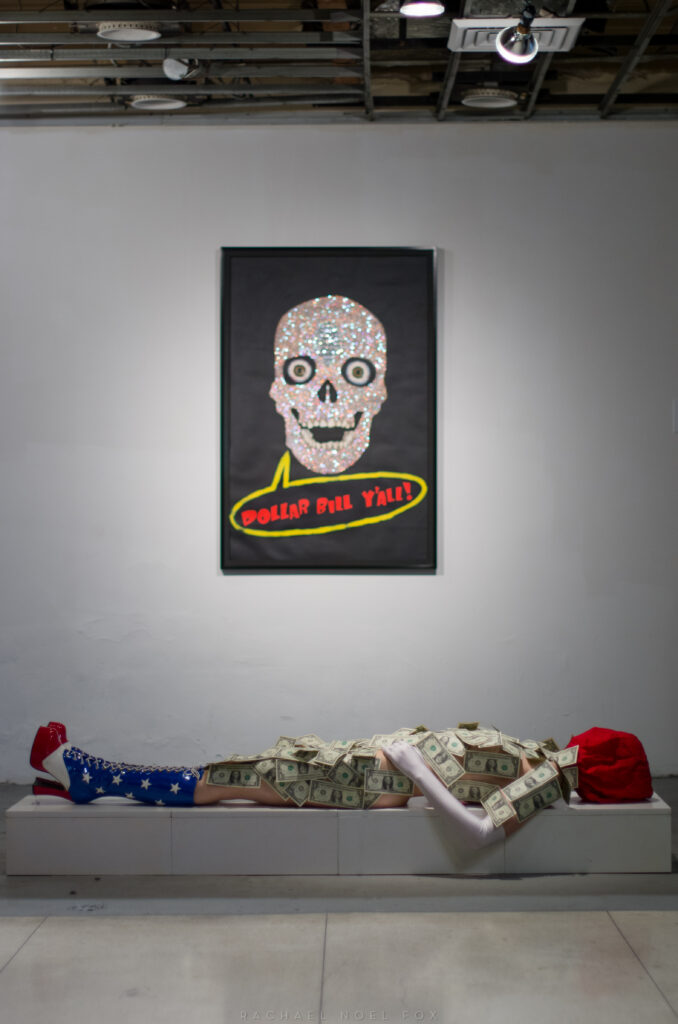 The theme of me wearing a skull helmet, the red corresponding to the pink highlights of the guitar player, the green color from the money, the dark red from my hair, etc…