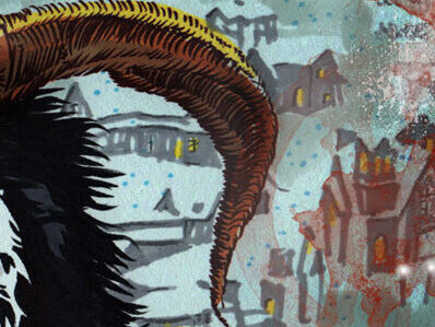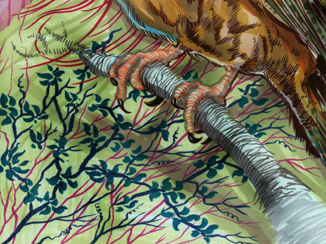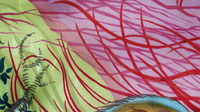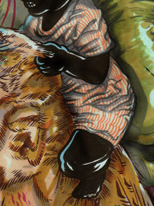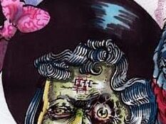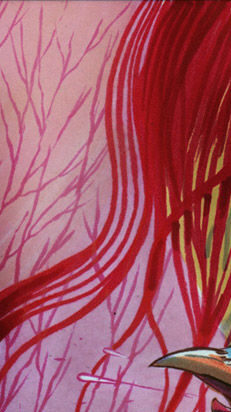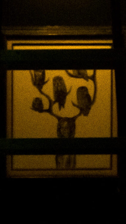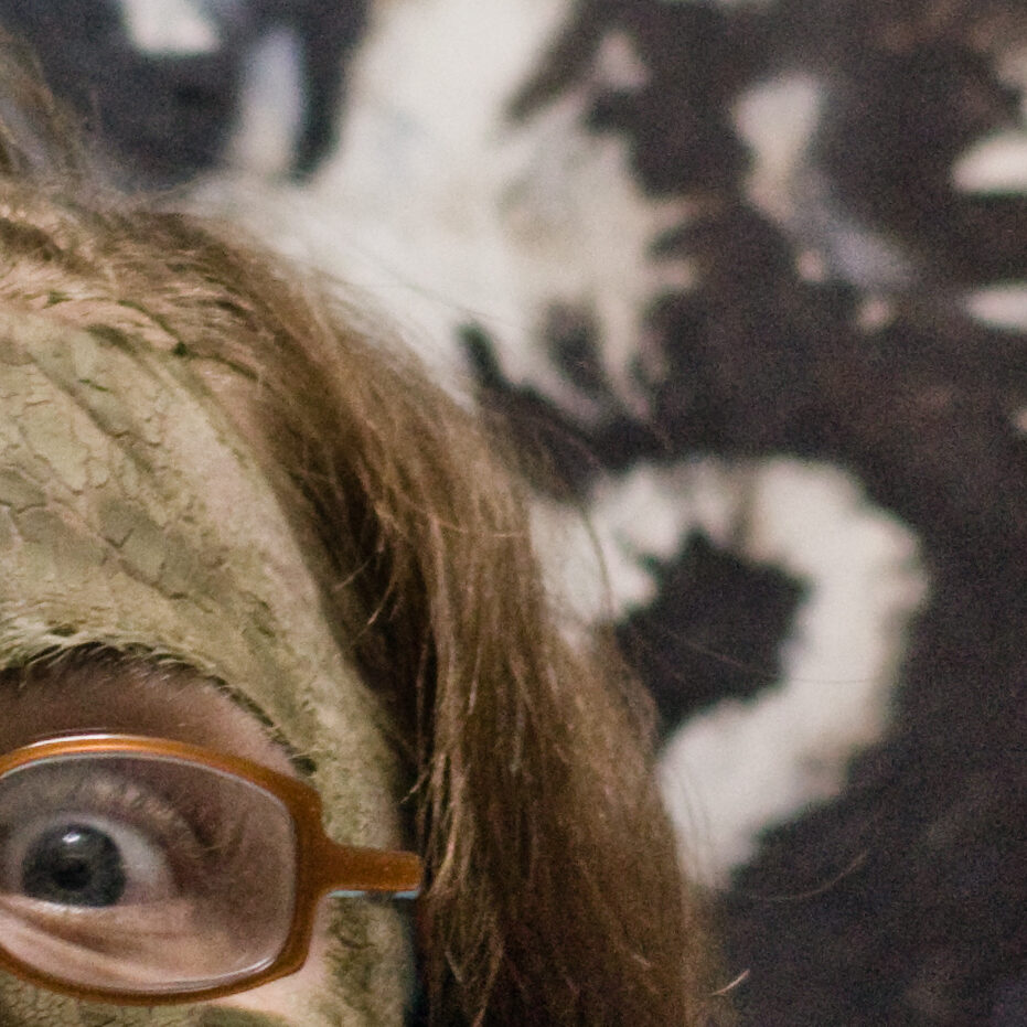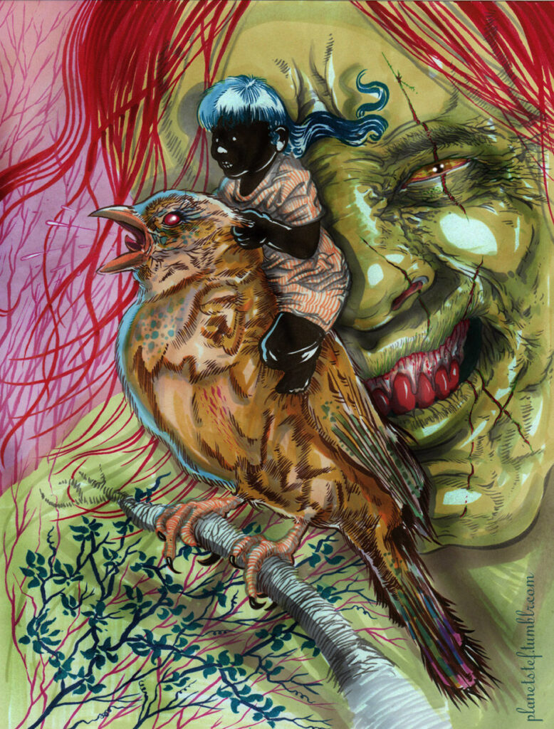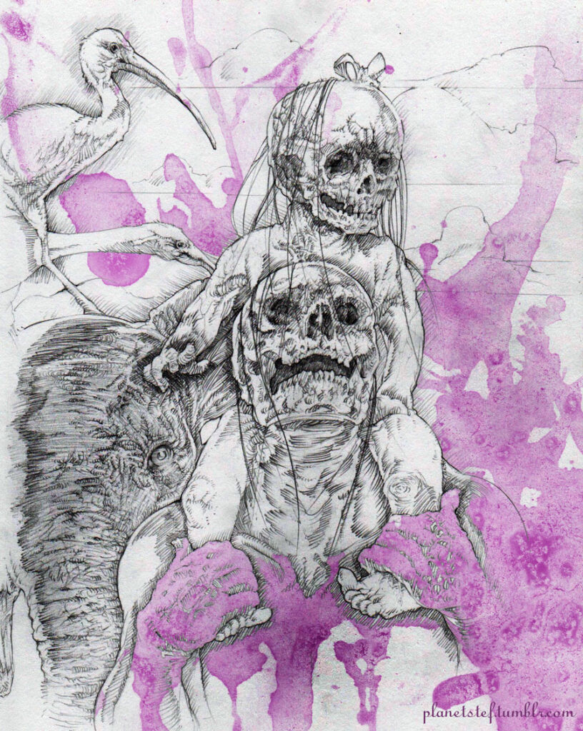 My flying brother inspires the bird. The leaves taken from the painted antique dresser behind him. Stefan becomes the riding girl, his camera makes for a strange round toothy mouth. Our faces combined for the witchy face behind, the scars on the face inspired by the shadows of scaffolding. [tumblr]