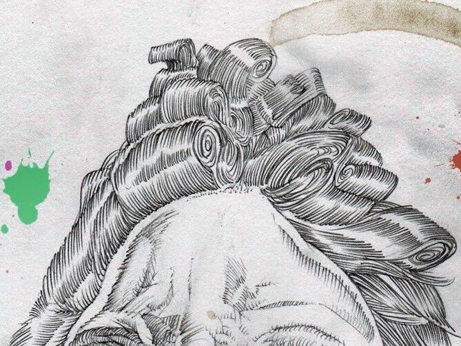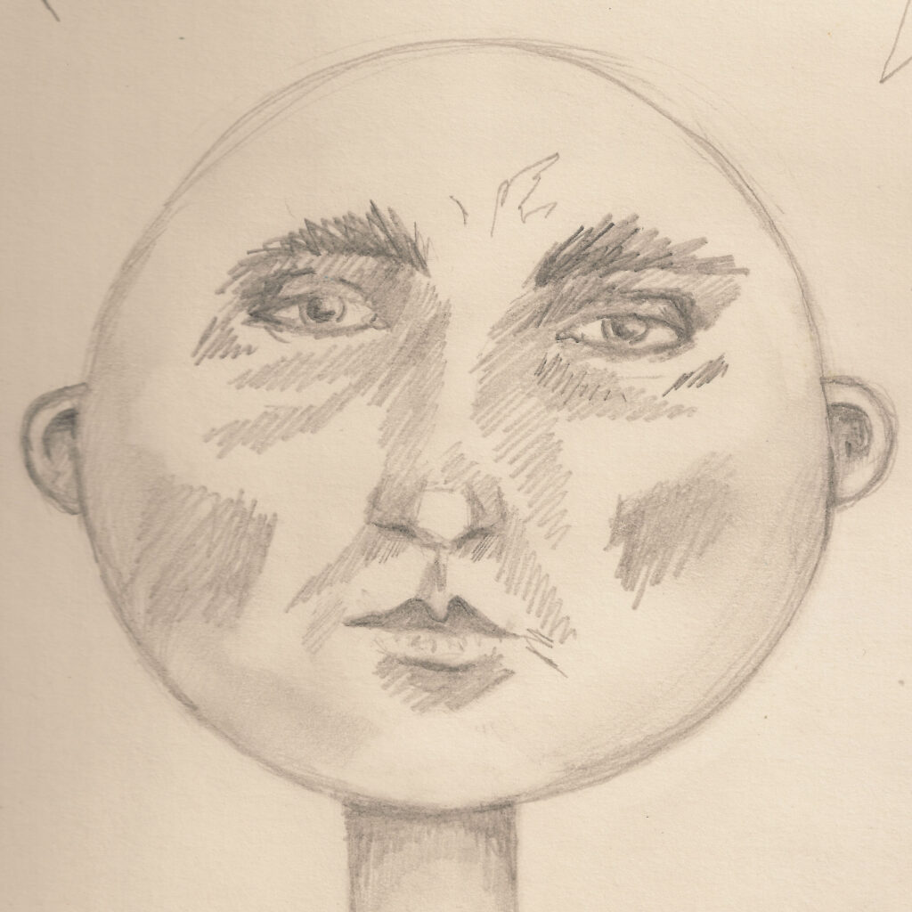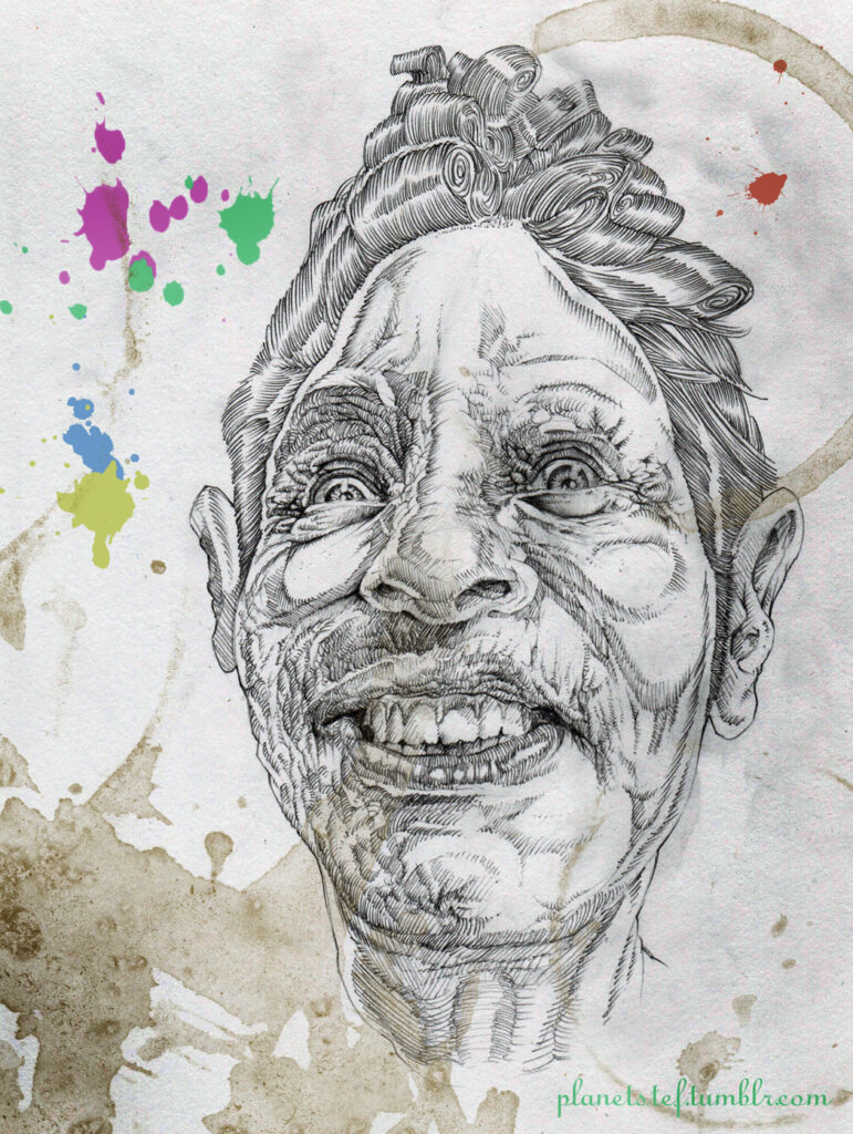 and then, combined, my sexy lips and shaggy curly hair leads him back to this drawing I’d given him. I had fucked up the nostrils and then the other side of the face (now digitally blurred) and started crying in frustration and wanted to throw it away, but Stefan took it with him so I wouldn’t destroy it.