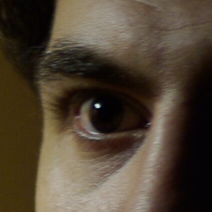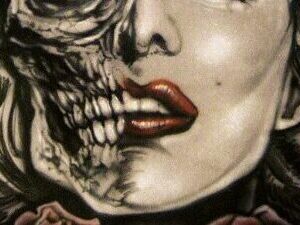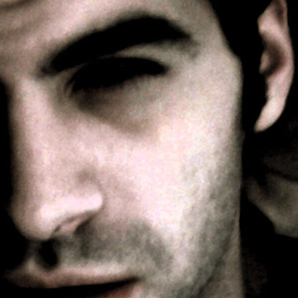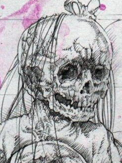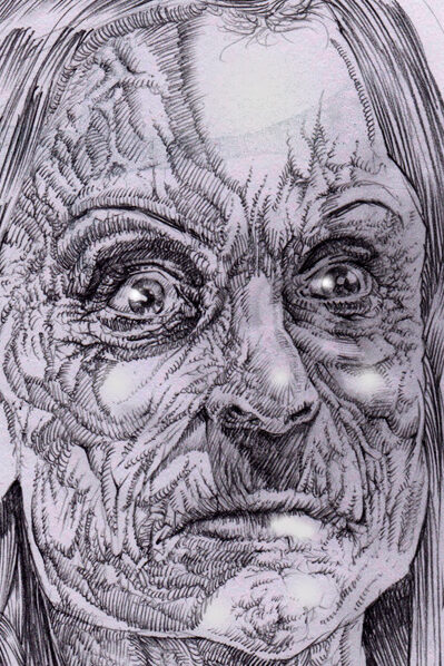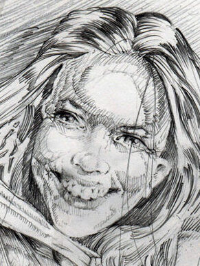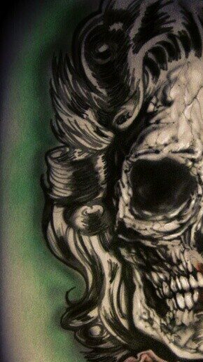 The lines he added to the cheekbone and jaw, as well as the skull face, mimic the hair wisps that cover my face in the glasses photo.