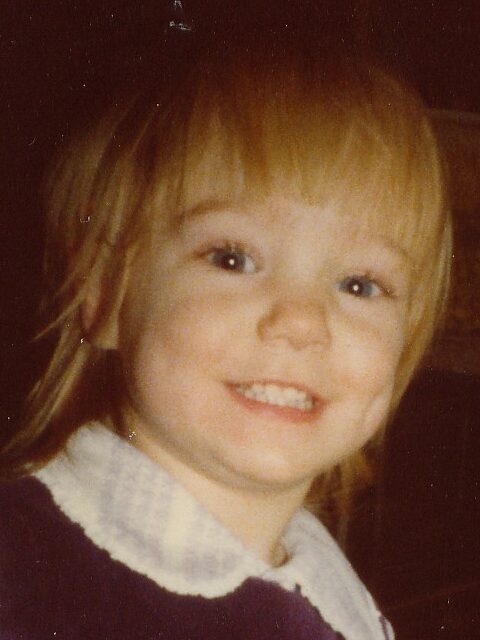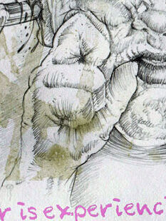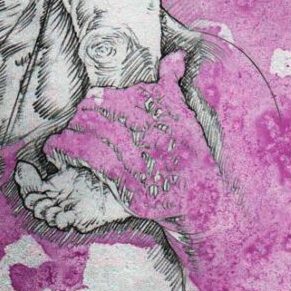 Using the pose of me on my father’s shoulders, he mixes it up with other childhood photos. The photo is tinted with the color of my lavender top, his lettering the color of my dark purple dress. Storks representing babies I assume, but elephants? For memory?