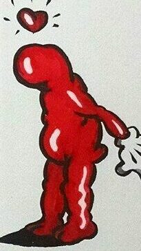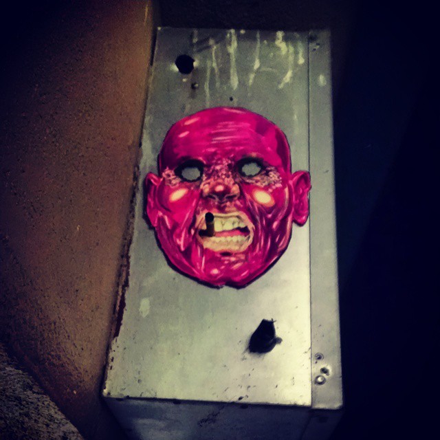 Four months prior in April I posted this, on my hand a sticker matching his mask in color, a background of a brown building and AC units.