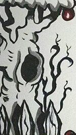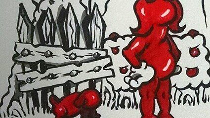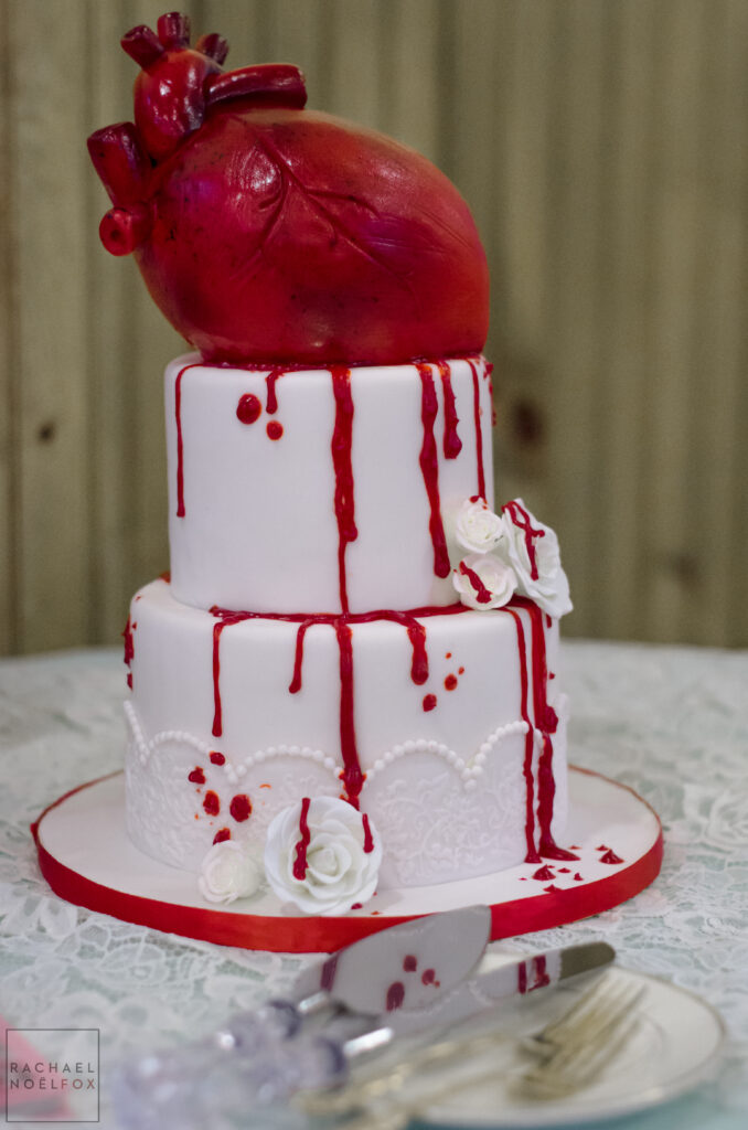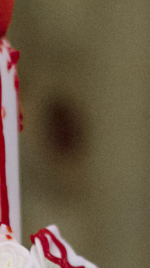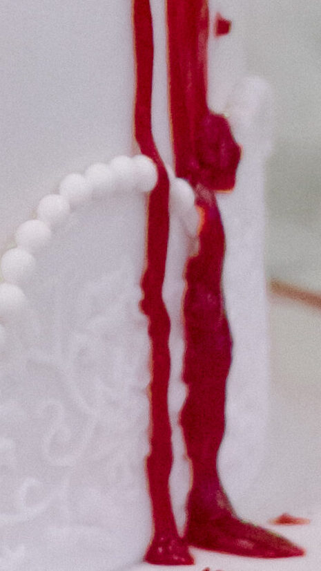 It’s a wedding, so you get a house with a white picket fence and a dog, the dots of blood becoming fruit, the knot on the wood behind the cake becoming a tree, the arcs on the cake design becoming tree branches.