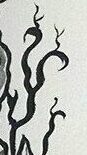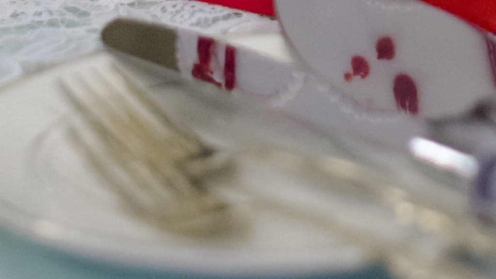 The four tined fork makes the fence, the reflection of cake ball-decor against the knife makes the fence slats with nails, the cake server with reflections of red makes the bush.