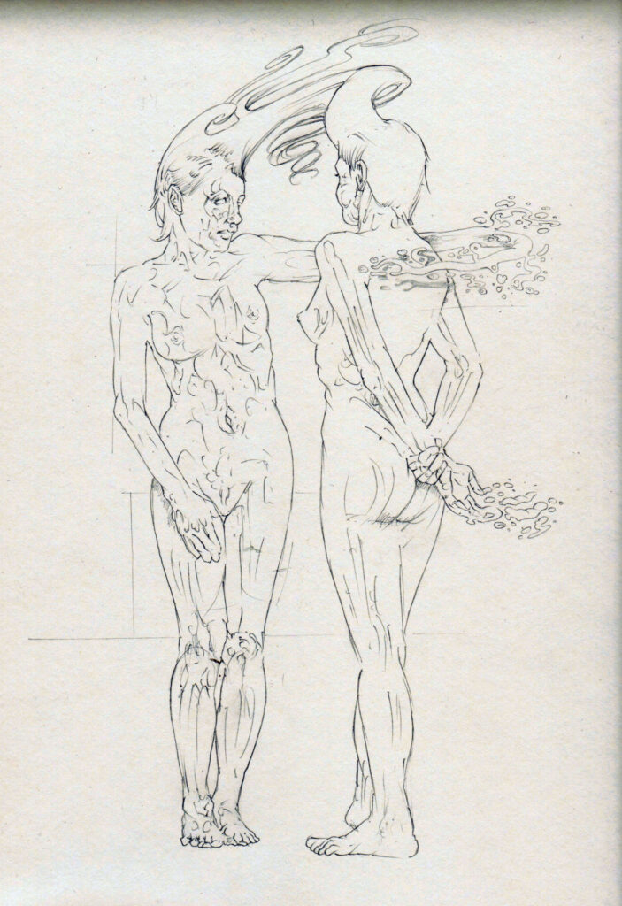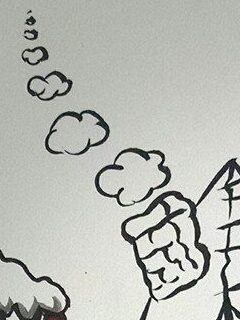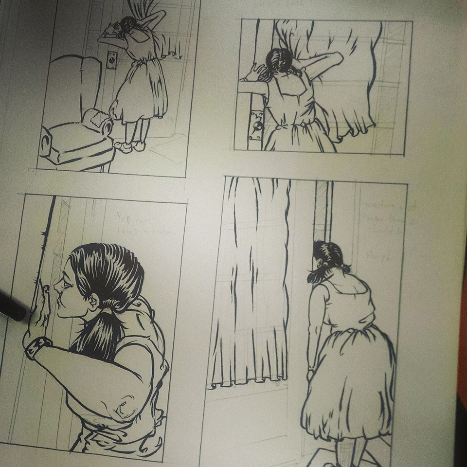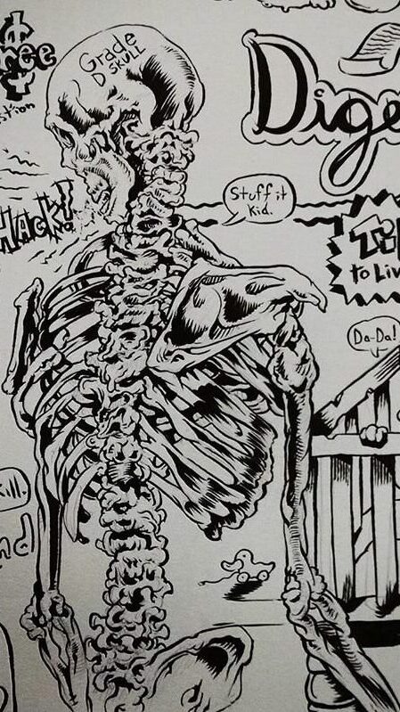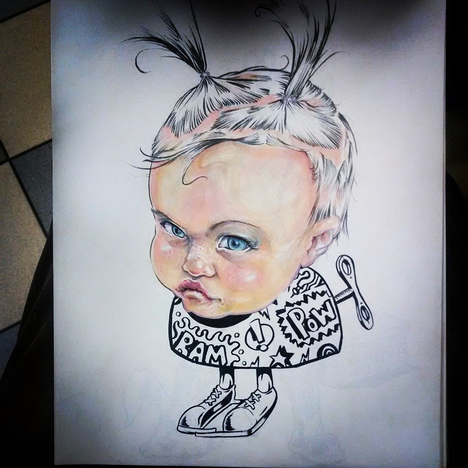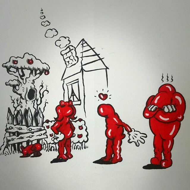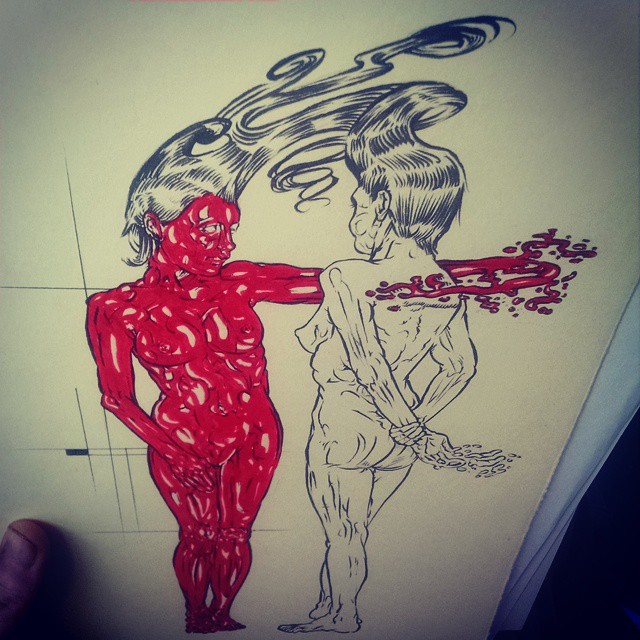 He adds a toy body with comic book expressions to an older drawing, makes sure to leave some diagonal tile and thigh behind and uncropped, like the askew pile of comics and poorly framed photos. [fb]