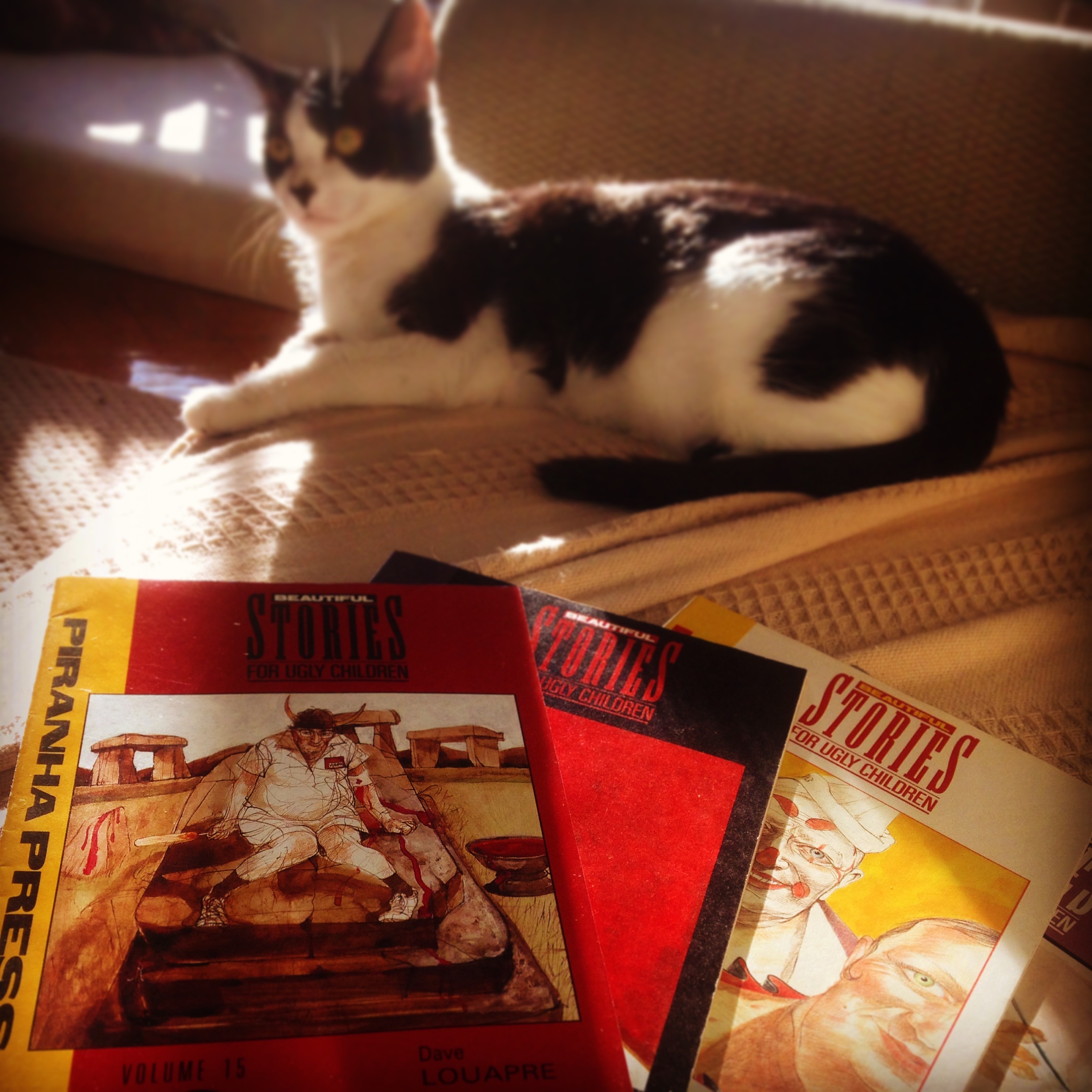 The red lettering and cat on the cover leads him to this photo I’d posted March 2015 of a comic book series “Beautiful Stories for Ugly Children” [IG]