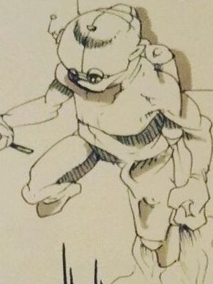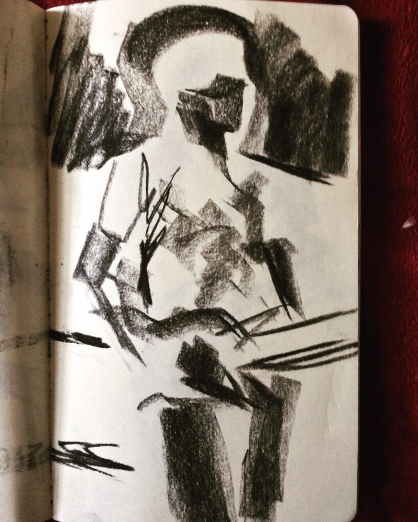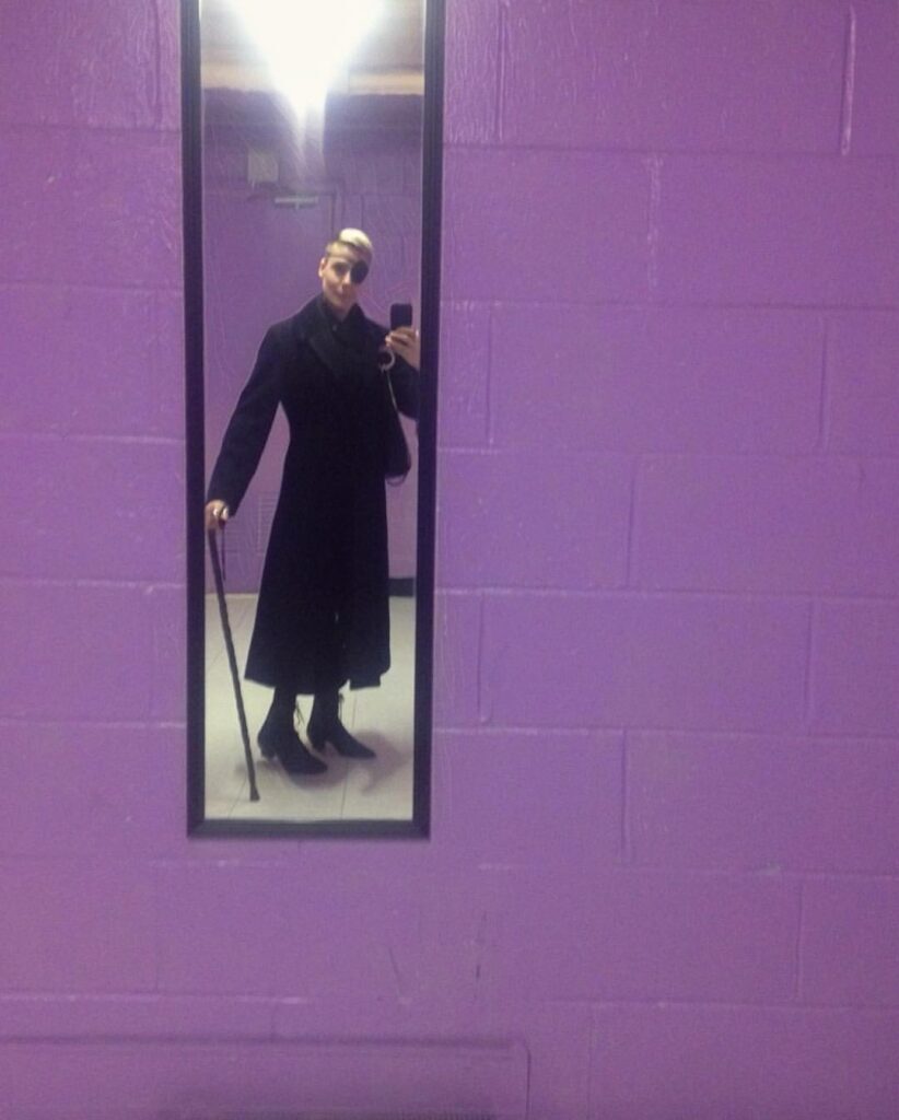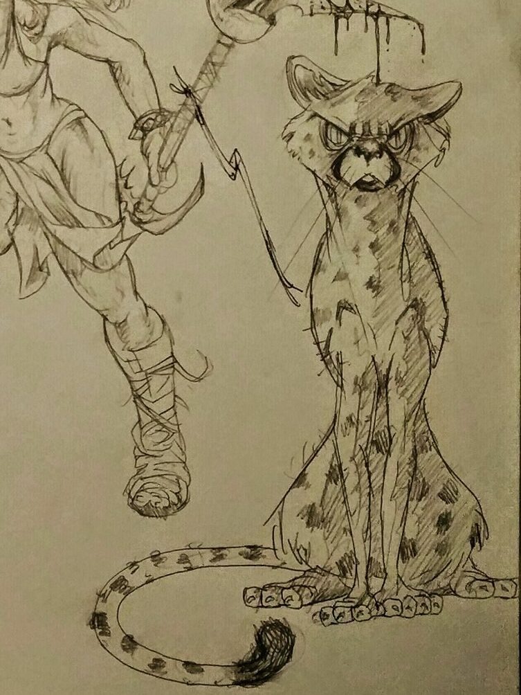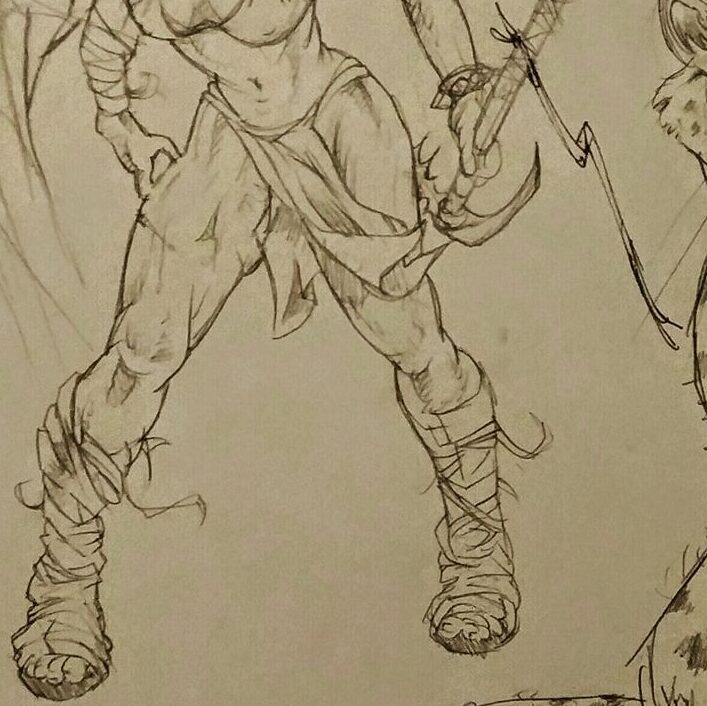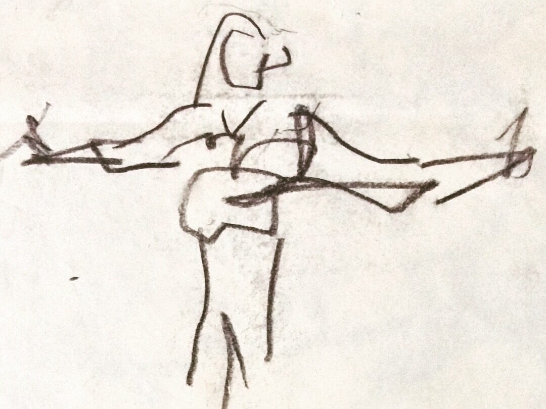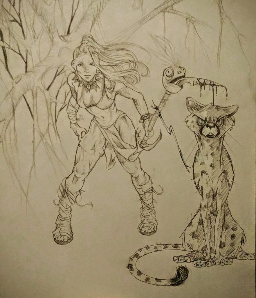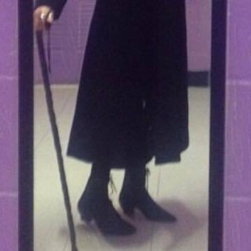 My cane becomes a staff. The laces from my boots and the wrist strap from my cane are replicated in the drawing.