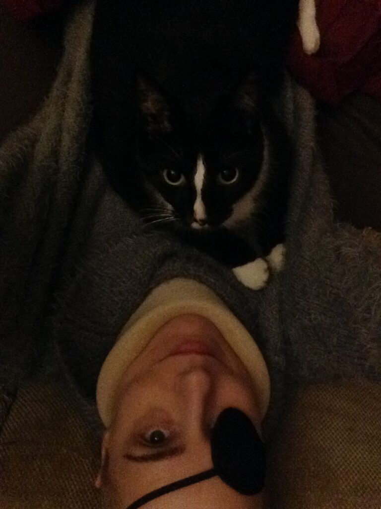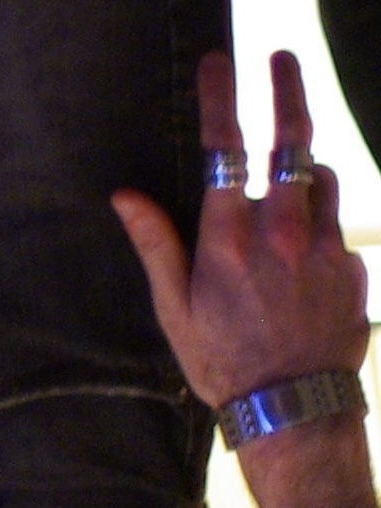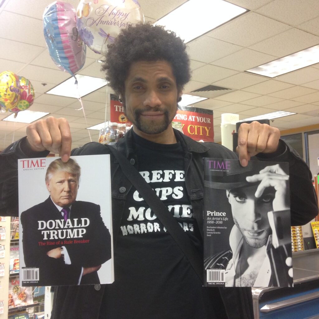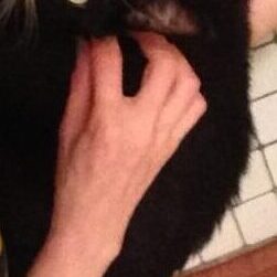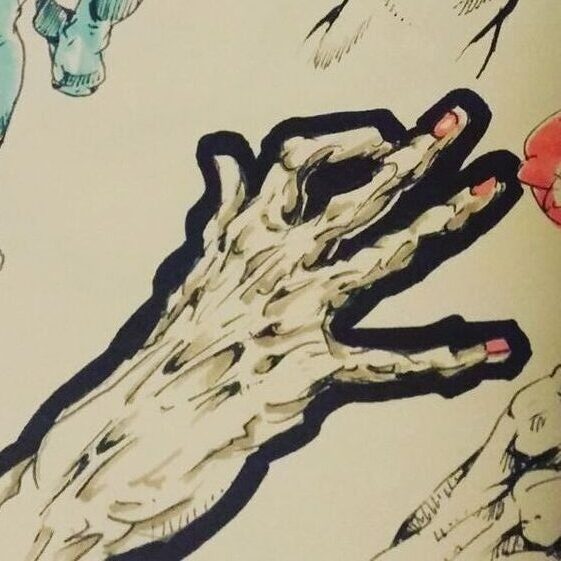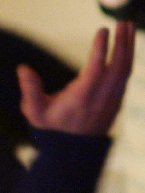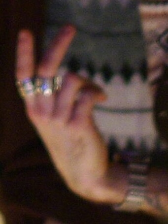 The light of the ceiling fan makes the the !? bubble, my cat scratches makes the laser, the blinds behind my nailpolish hand makes for vertical lines, the cat I’m petting makes for a thick black outline around my petting hand, Prince’s gnarled fingers appear at the bottom. [fb]
