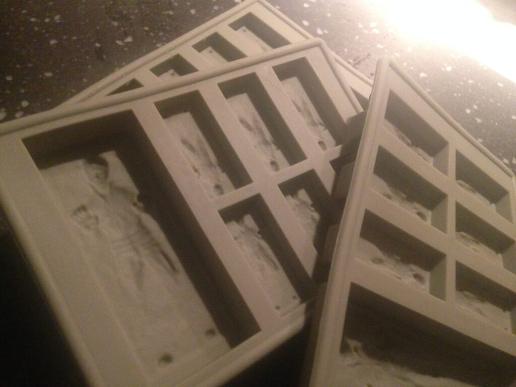 Uploaded two months prior. Han Solo molds for icecubes. The large Han Solo is upright, the smaller ones upside-down.