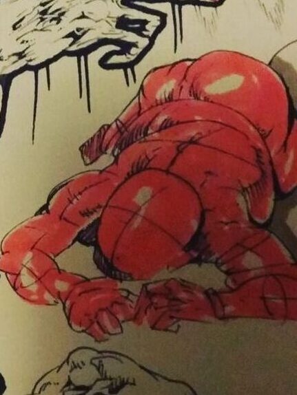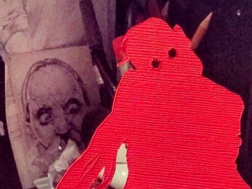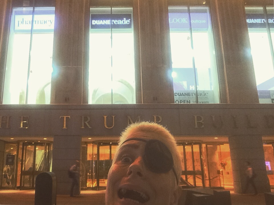 Three weeks apart. [IG] Not only the same expression of toothy horror and one eye, but he matches the blue glow of light above with the warm demonic light of the Trump building below.