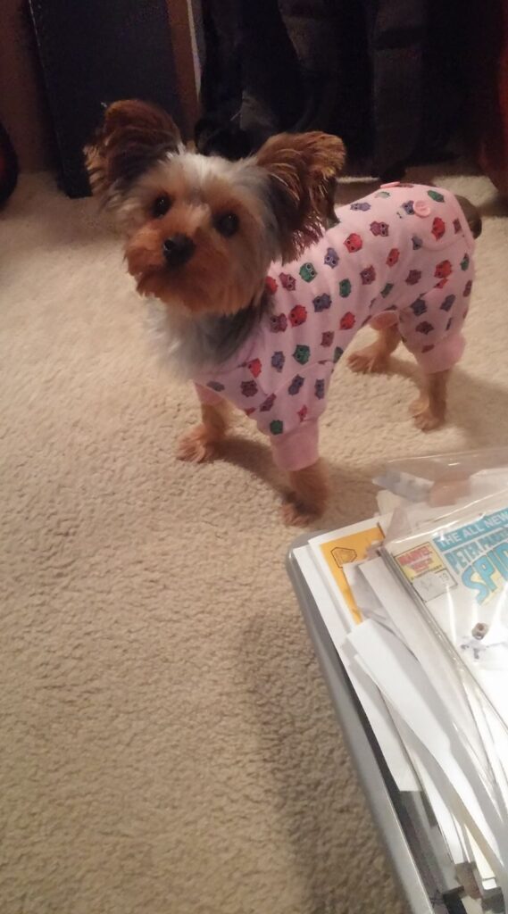 And so, Stefan photographs his dog in clothes beside a pile of comic books. [fb]