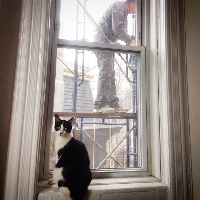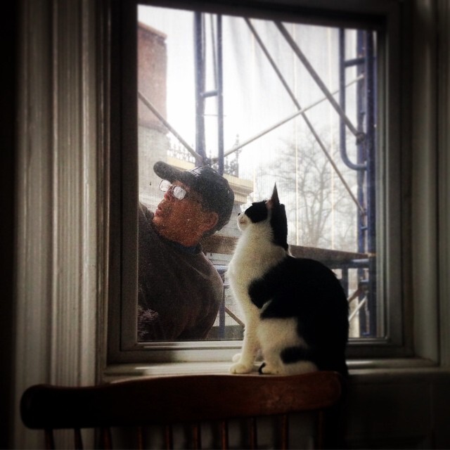 leads Stefan to workers outside my windows in March 2015, Miss Kitka on the windowsill. [IG]