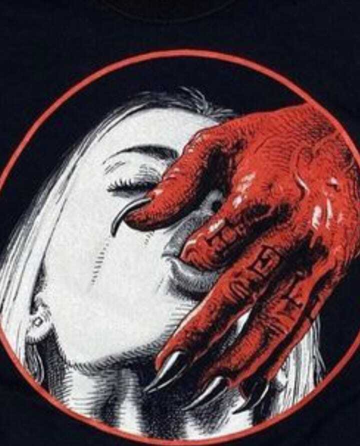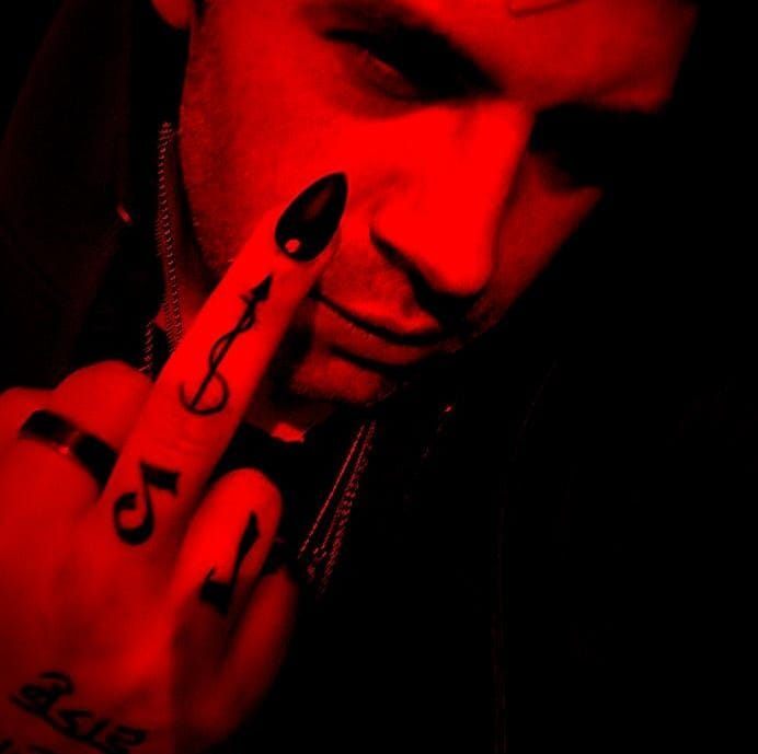 Stefan dons pointed black nails, like the character Darkness, and shows his middle finger with the 2 and the purify glyph. A perfect pair. [fb]