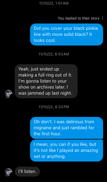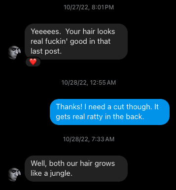 Two months prior. I ramble about the positives of pain days with ever declining health. [IG] He says it’s all downhill from here. [IG] He promises me. He’s still wearing the nails.