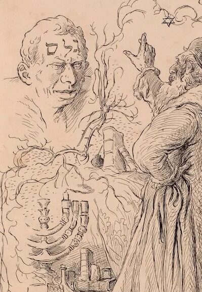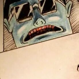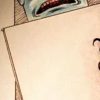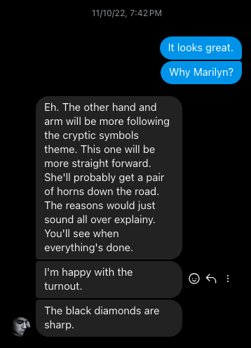 In the center of the monster’s forehead is Marilyn’s mouth, but he’s simplified into a rounder shape, like the mark on the Golem’s forehead. Instead of teeth there is a small line of highlight, reminiscent of both the hebrew letters on the Golem’s forehead, and Stefan’s ever-present hair curl.