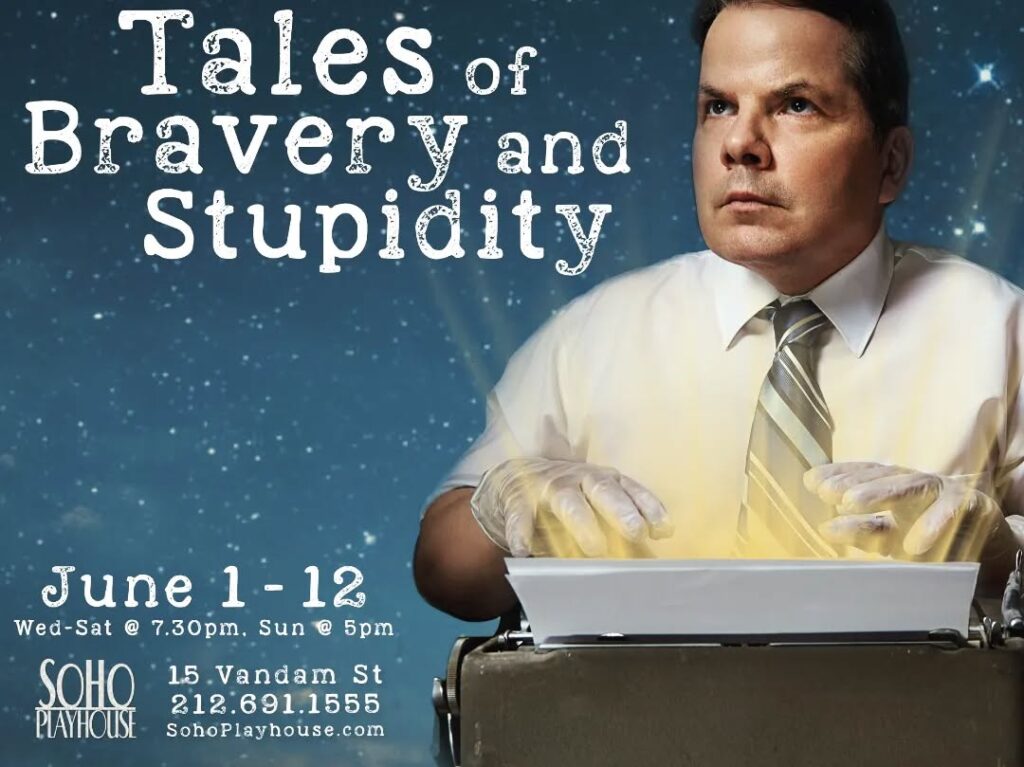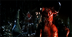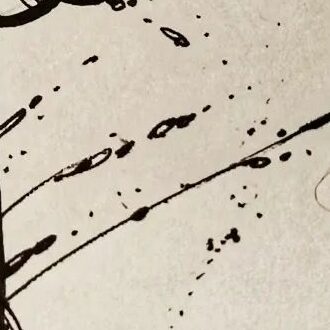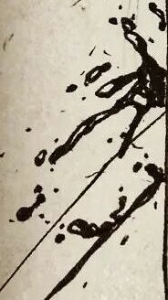 The angled blood splatter in the background for the beams of light coming from Bruce McCullough’s typewriter. [IG]