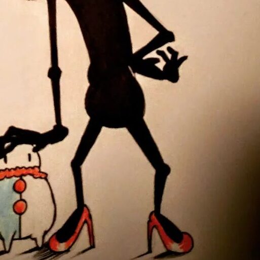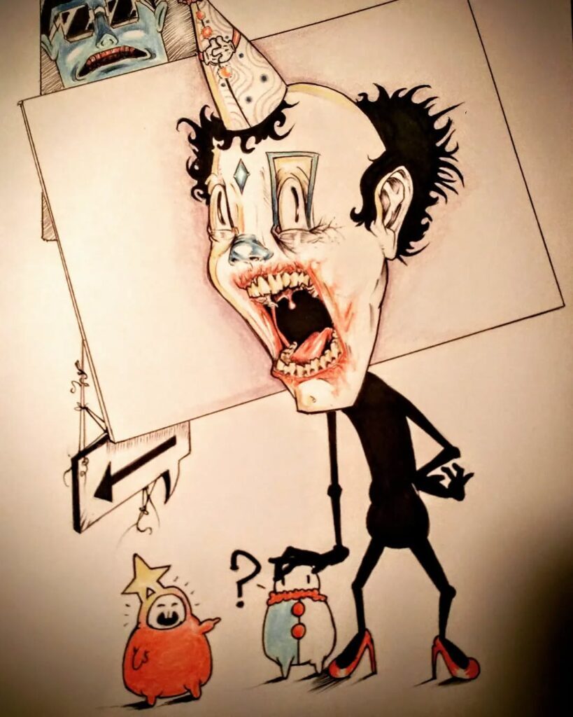 The silhouette of the Black Knight becomes the main figure, the red design on his chest inspiring the red high heels. Hands clasping football helmets are used on the hat, the dots on the helmets used in the pattern, as is the wavy lines of brain. From the older image… my nudity censoring becomes an arrow. The color palette of the lettering dictating the color of the drawings. My King Crimson face becomes the clown. Friend pointing at friend with red plaid shirt that becomes red buttons, the stars from the flag behind me become a star atop his head. I combine with the blue flag behind me for the face at the top, my eyepatch becoming black sunglasses. [IG]