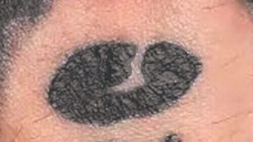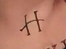 The H at the base of his neck is an alchemy symbol meaning “pulverize” with, I believe, a dual meaning of “H for heroin” and a bent needle. Kill the addiction.
