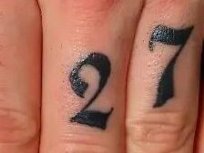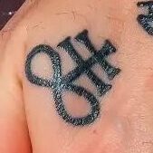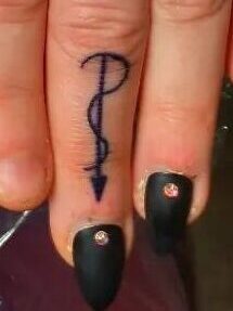 The arrow with squiggle on his middle finger is known as a symbol of alchemy meaning “purify”. It’s on the same finger as the 2, so a pure union, a perfect pair?