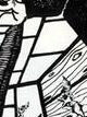 He recreates the window and cracked wall from the other Cronenberg image, and he leaves a strip of white uncropped at the bottom of his drawing, like the banner of white at the bottom of the theater graphic. The long hair, from the upper photofraph, the face and fist from the photo to the left, the body from the photo on the right. [IG]