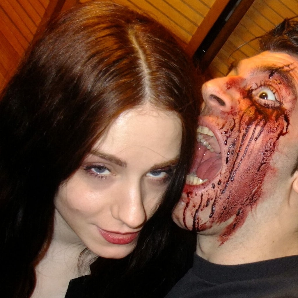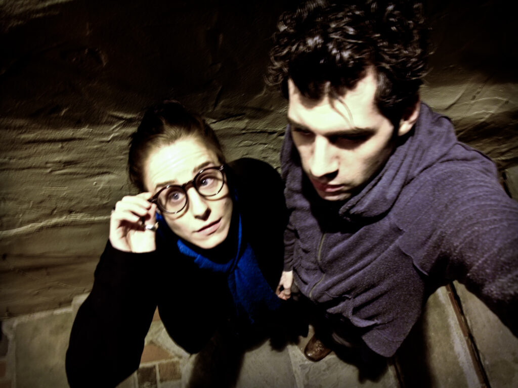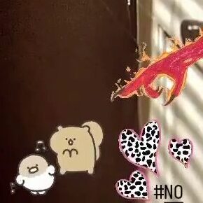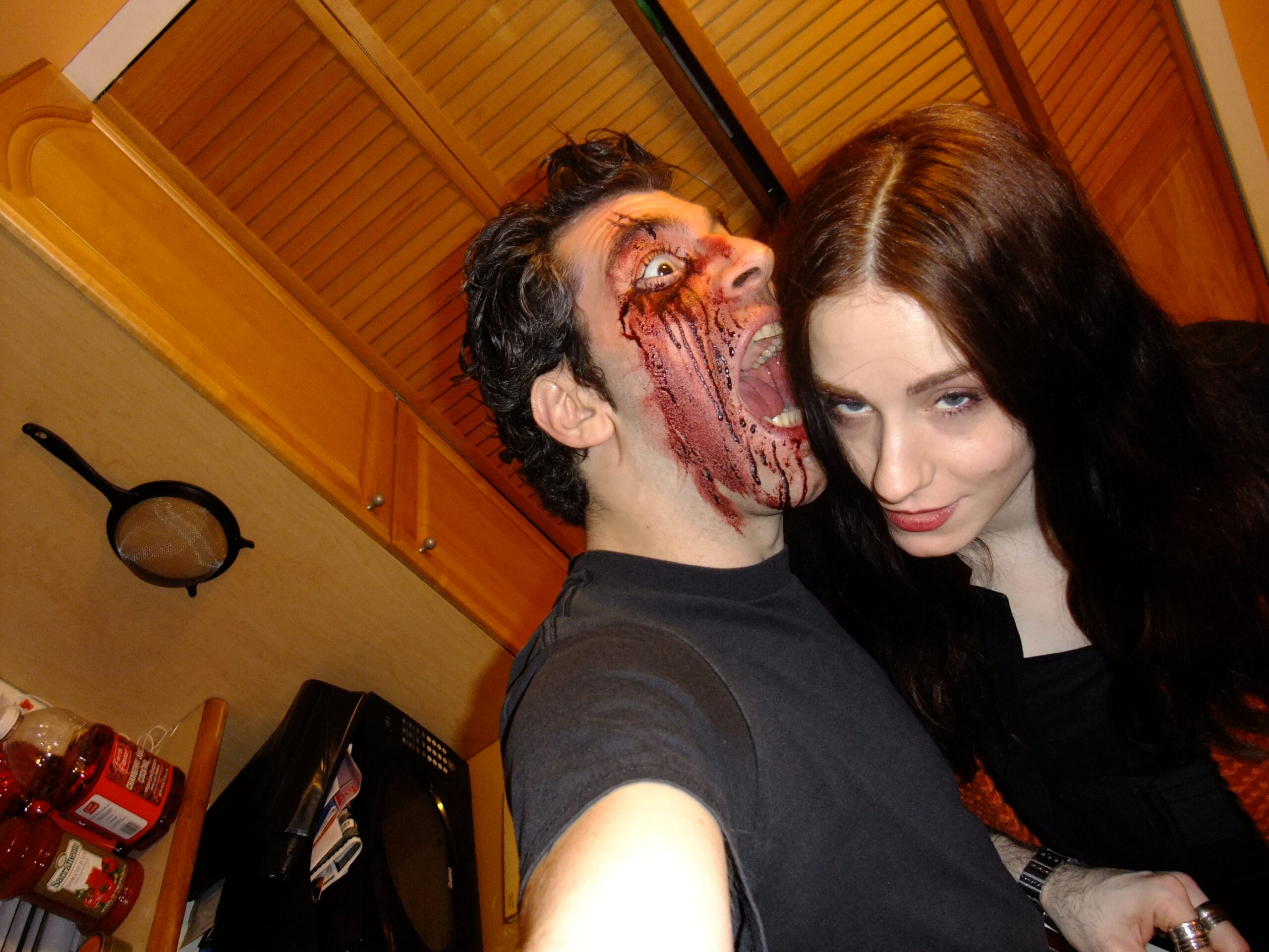 He puts white lettering over his face like the door signs; her face, lower than his, making a similar face as the DISTURB placard. [fb]