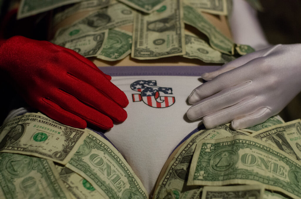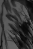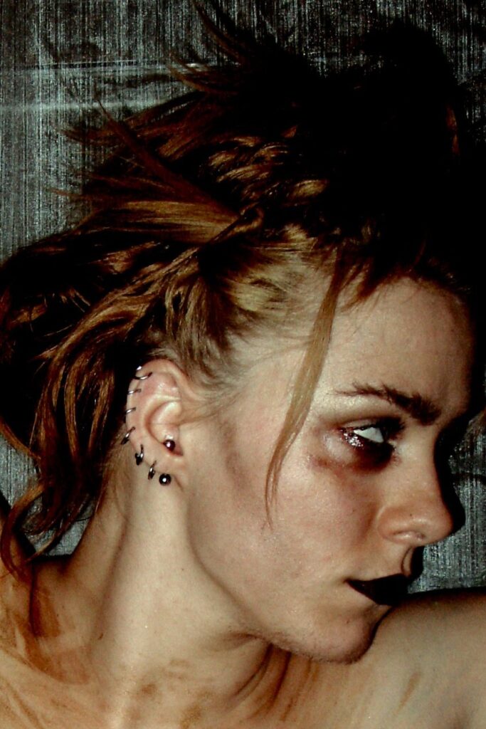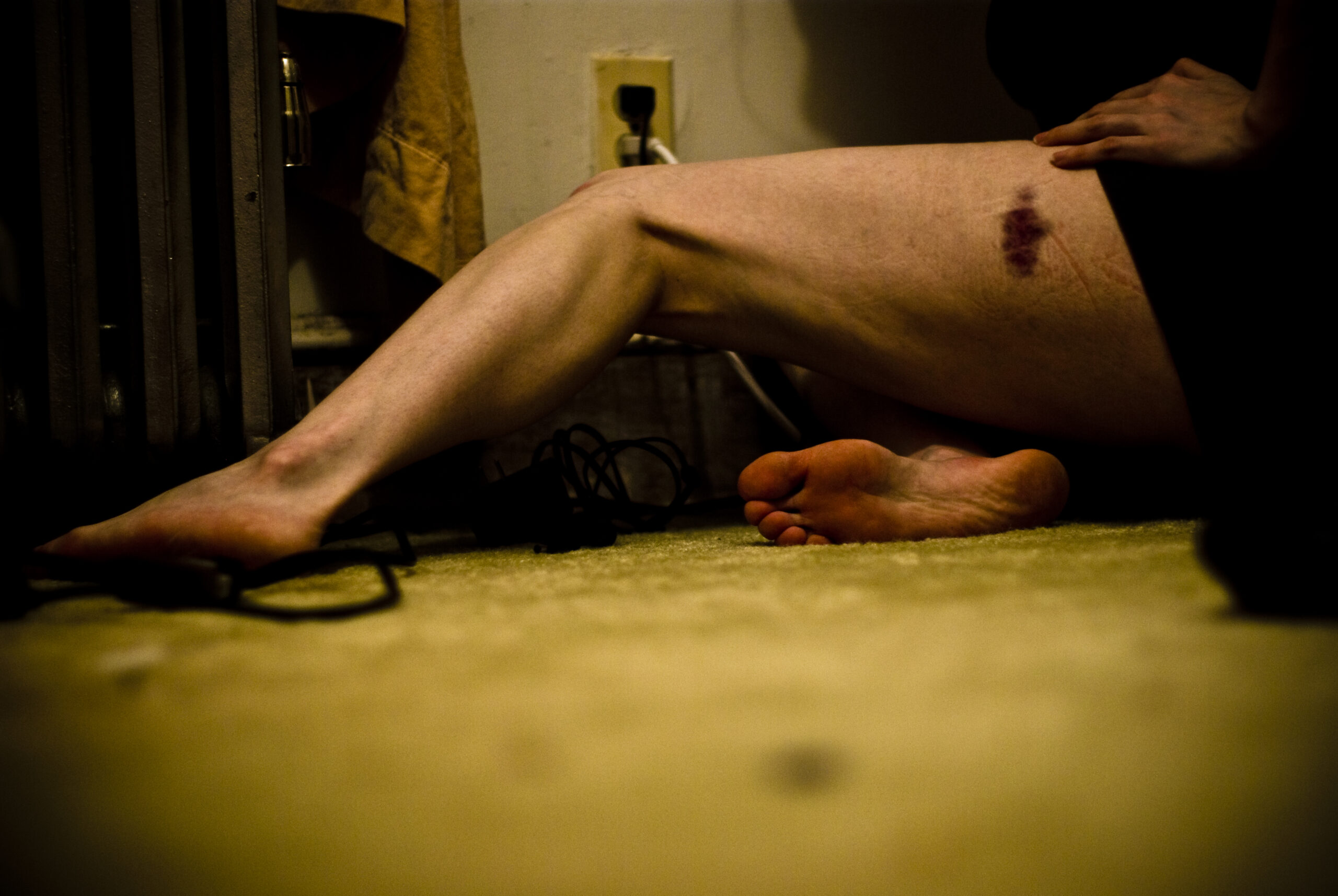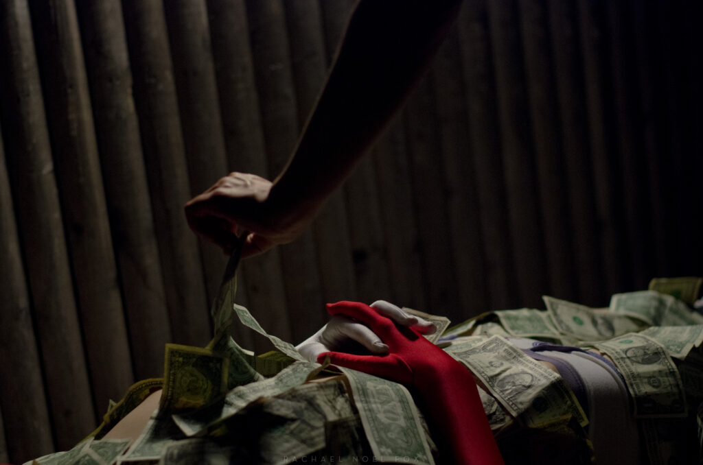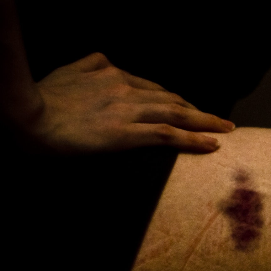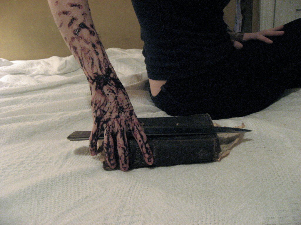 The red hand on white skin leads him back to these performance artist photographs [flickr]