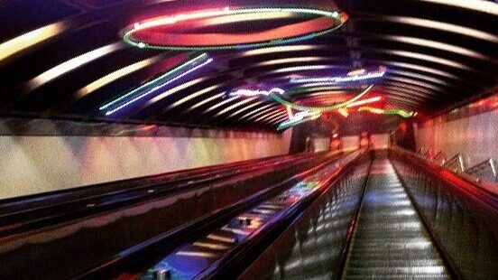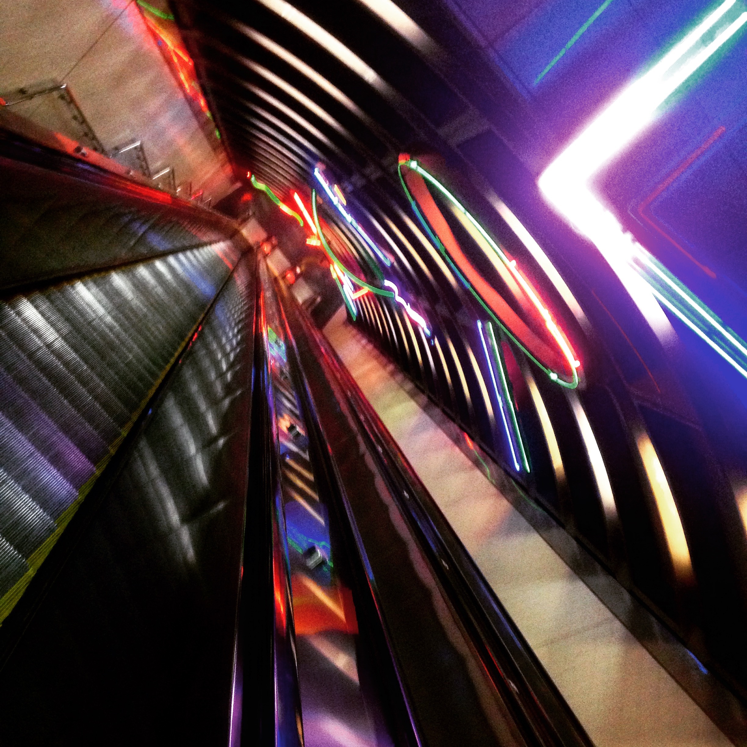 A 2015 shot I took in Jersey City with a red circle on the ceiling of the escalator. [IG]