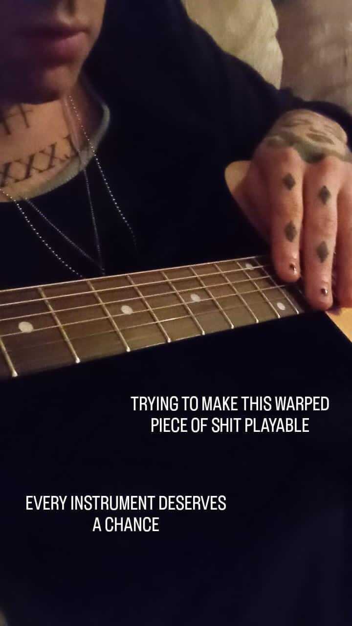 Stefan’s photo shows a guitar neck at the same angle as the crosswalk, fingers matching the building color on the upper right, his caption: “Trying to make this warped piece of shit playable. Every instrument deserves a chance.” [fb]