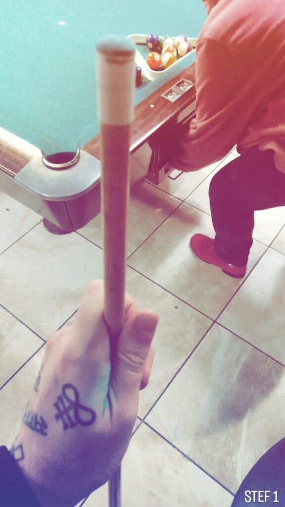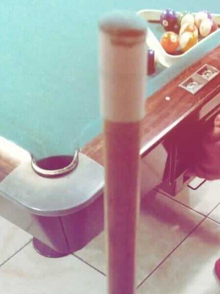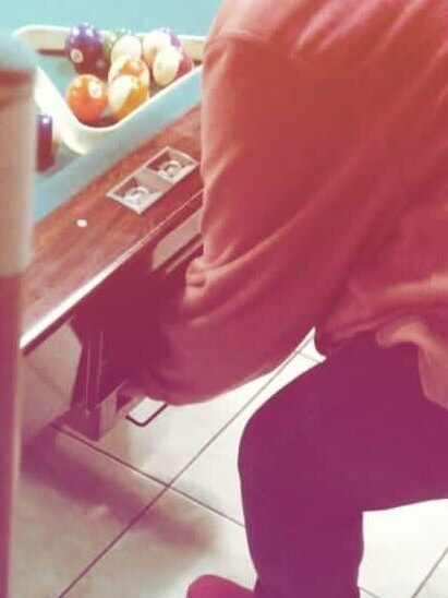 The digital covering of my bits with circles and a triangle brings him to billards, the table angled like my selfie, his one hand visible, like mine.