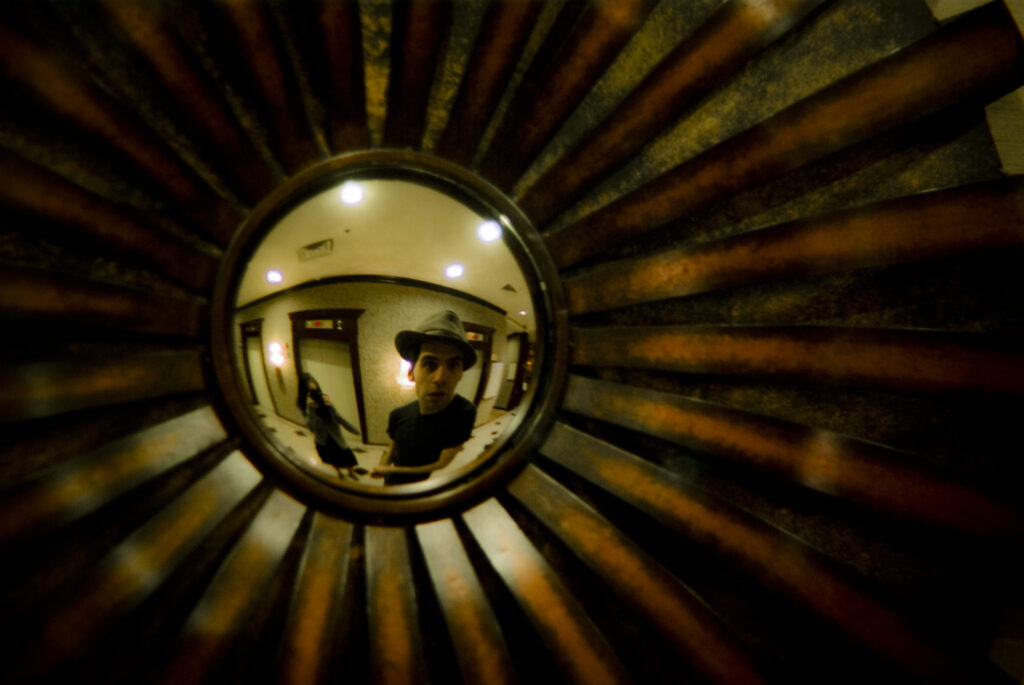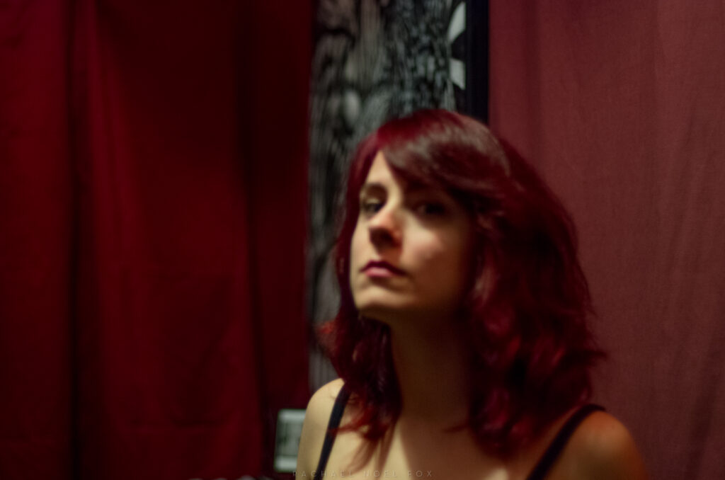 The red light, the elements of purple, the black bottle (?) in a box like my reflection framed in the mirror. [fb]