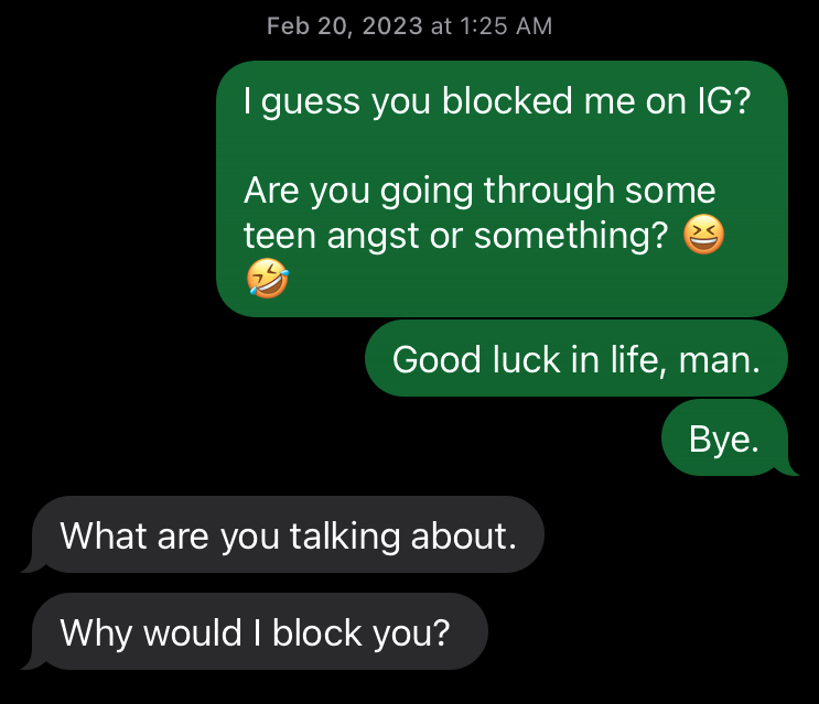 I wasn’t blocked, I was restricted. My response was flippant, but I was trying not to reveal how hurt and betrayed I felt.