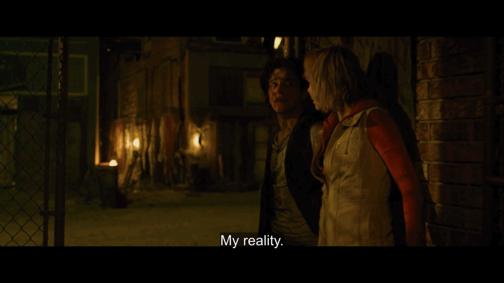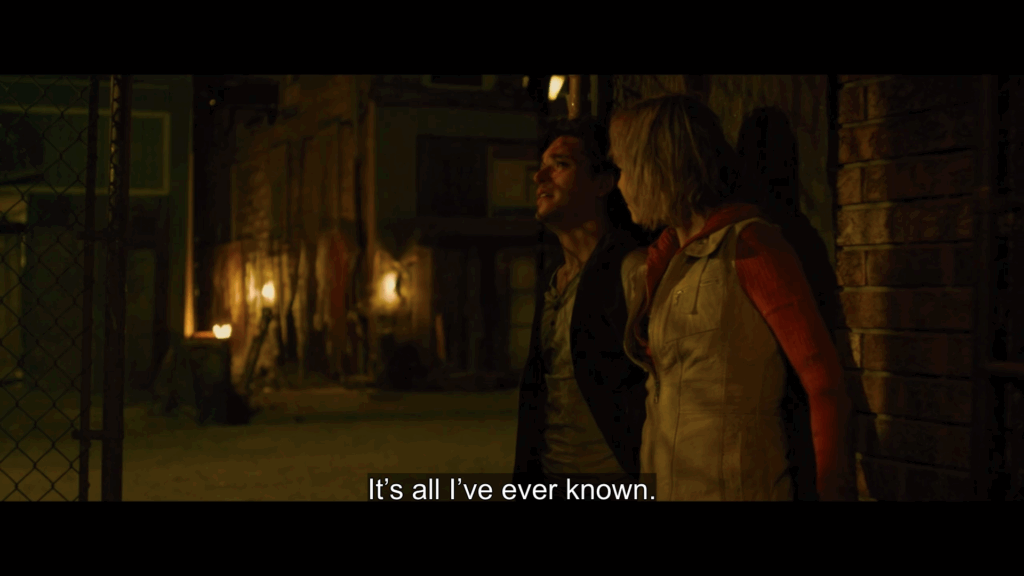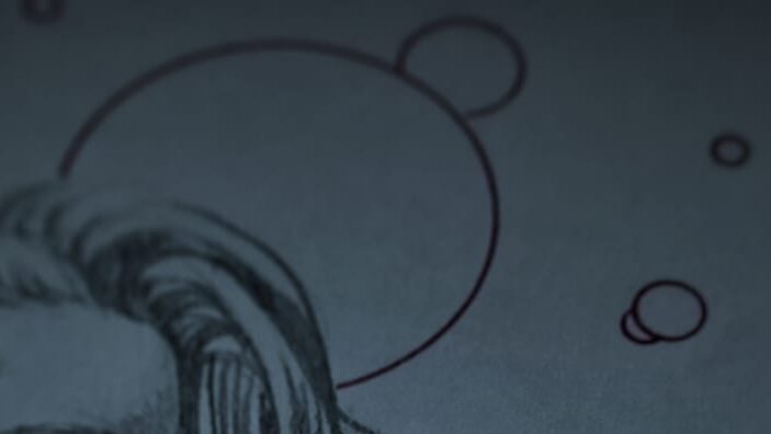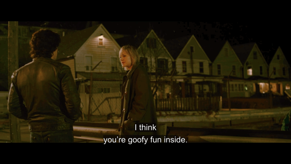 His song choice is what makes the connection. The scene filled with tones of brown, a blue painting in the background matches Chacka’s eyes, he adds diagonal lettering like my own. [IG]