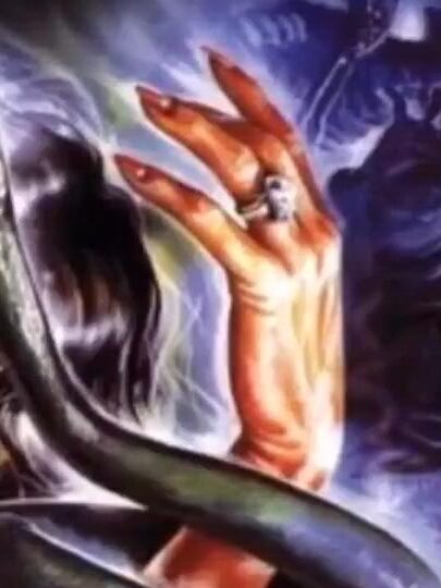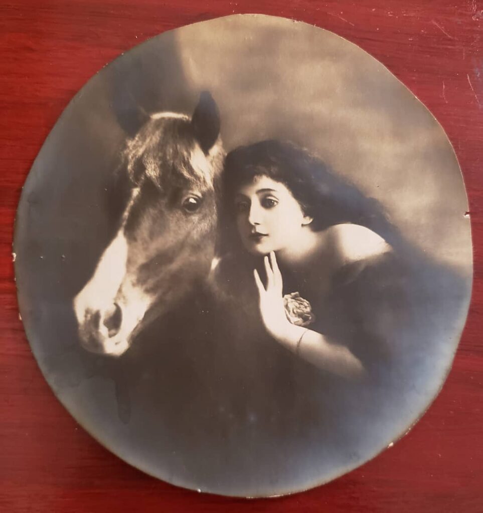 A circle surrounded by red. In April 2018 post an antique photo of a woman with a horse, a rose and a hand. [IG]