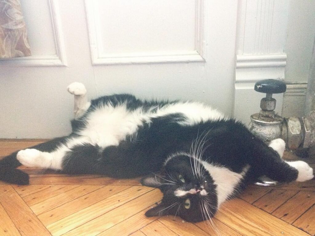 Stefan posts a cat on a leash, his colors matching the tile background, the man with a similarly wide stance. [fb]