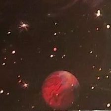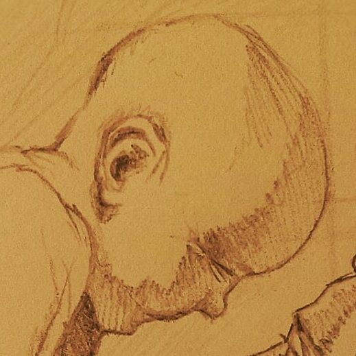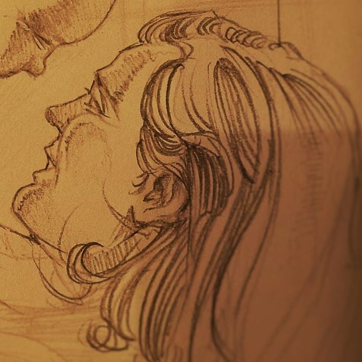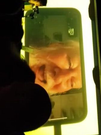 Stefan posts this painting to instagram, filtered and hyper contrasted, stars shrouded in shadow, lines of forehead wrinkles like the lines of wood flooring, a small bit of light on the lower left, like the person’s camera screen. [IG]