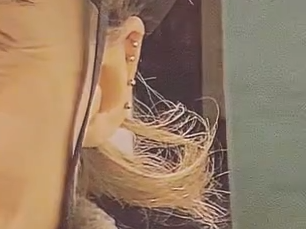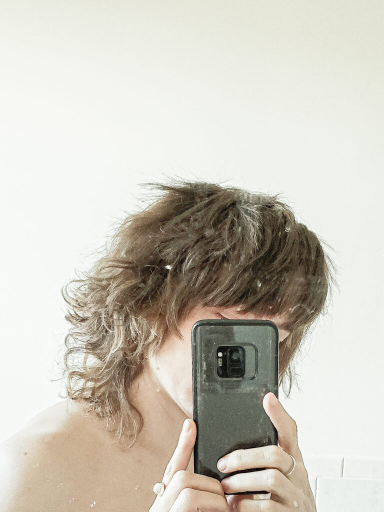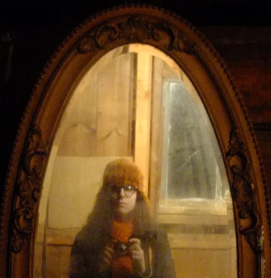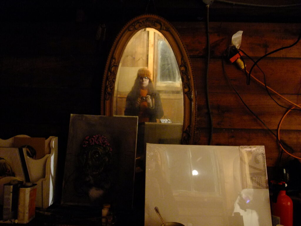 Stefan draws the curls of hair from the ornate mirror, the same dorky haircut, but with the height of the orange hat, and my bleached away eyebrows. The blue glow from the window in the background. [IG]
