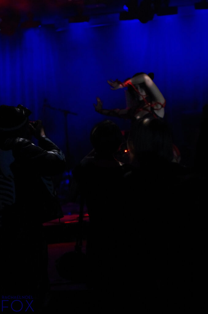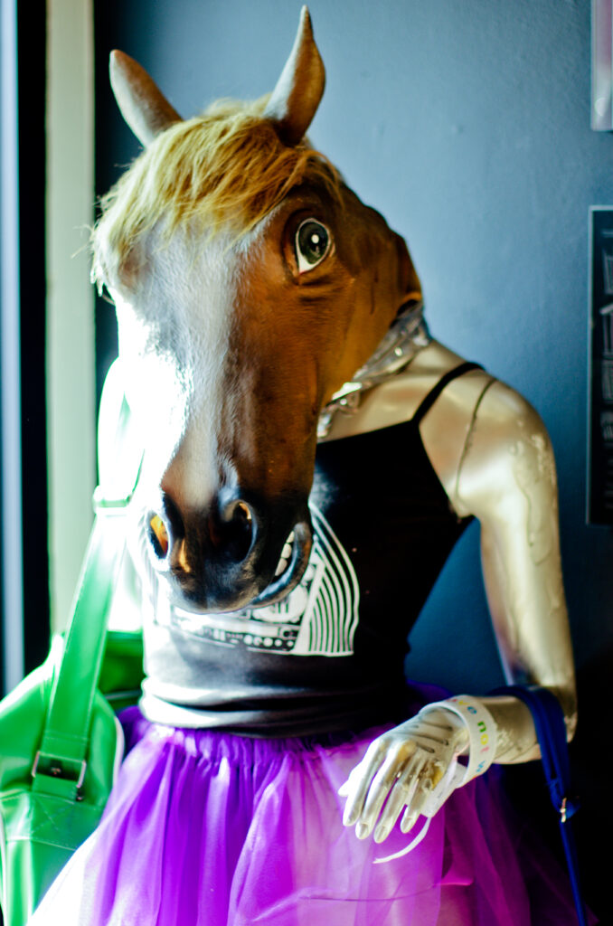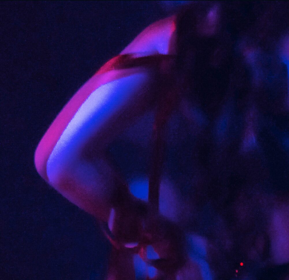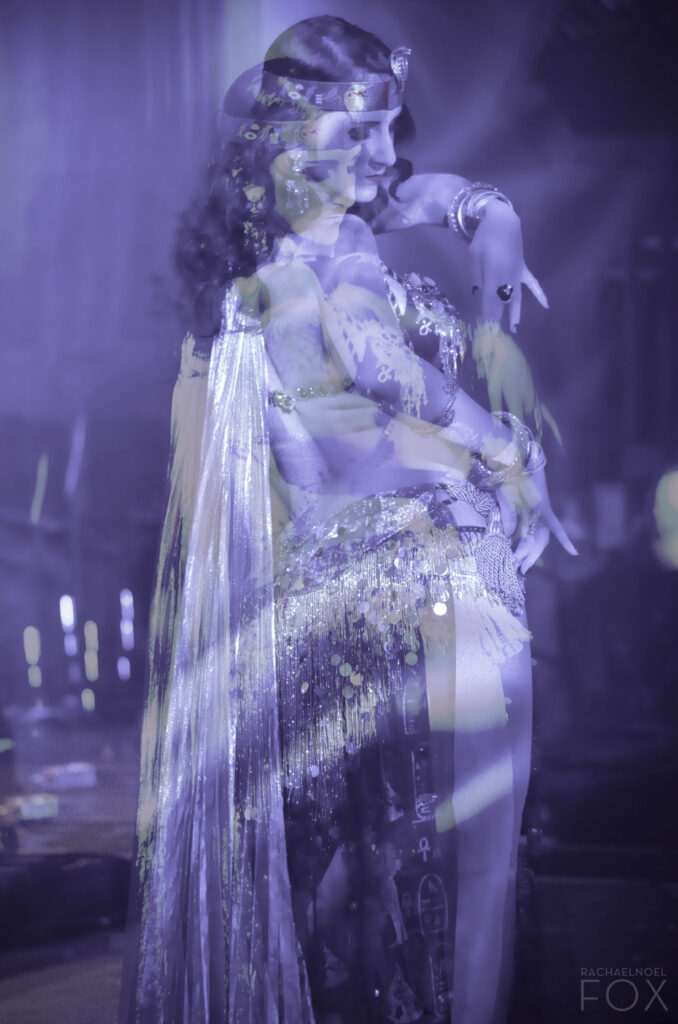 Two photos of facelessness combined in his portrait. In this new mashup, he’s duplicated his high contrast and grainy texture with my pose. Blue from the highlights of the Farscape outfits. Marilyn visible.