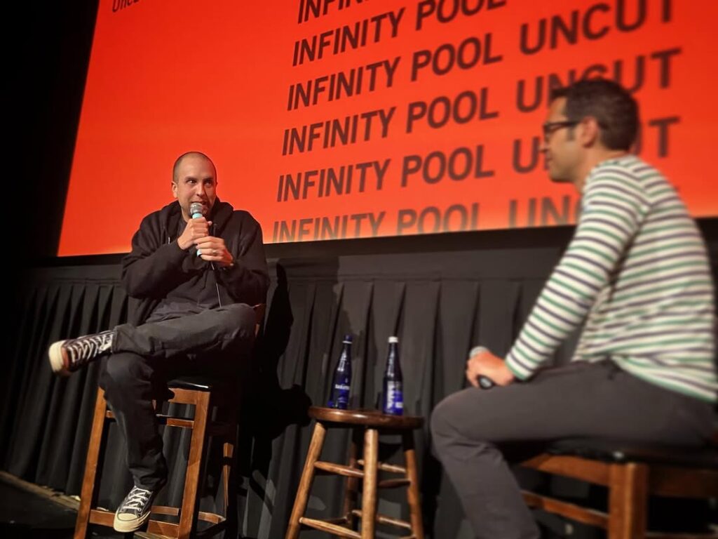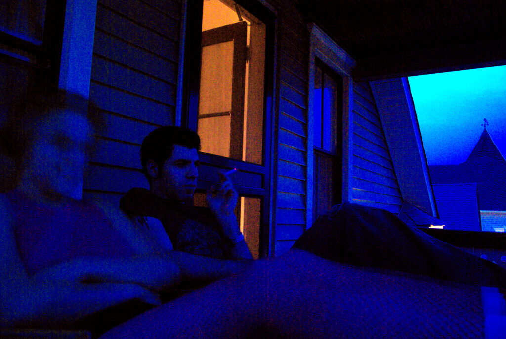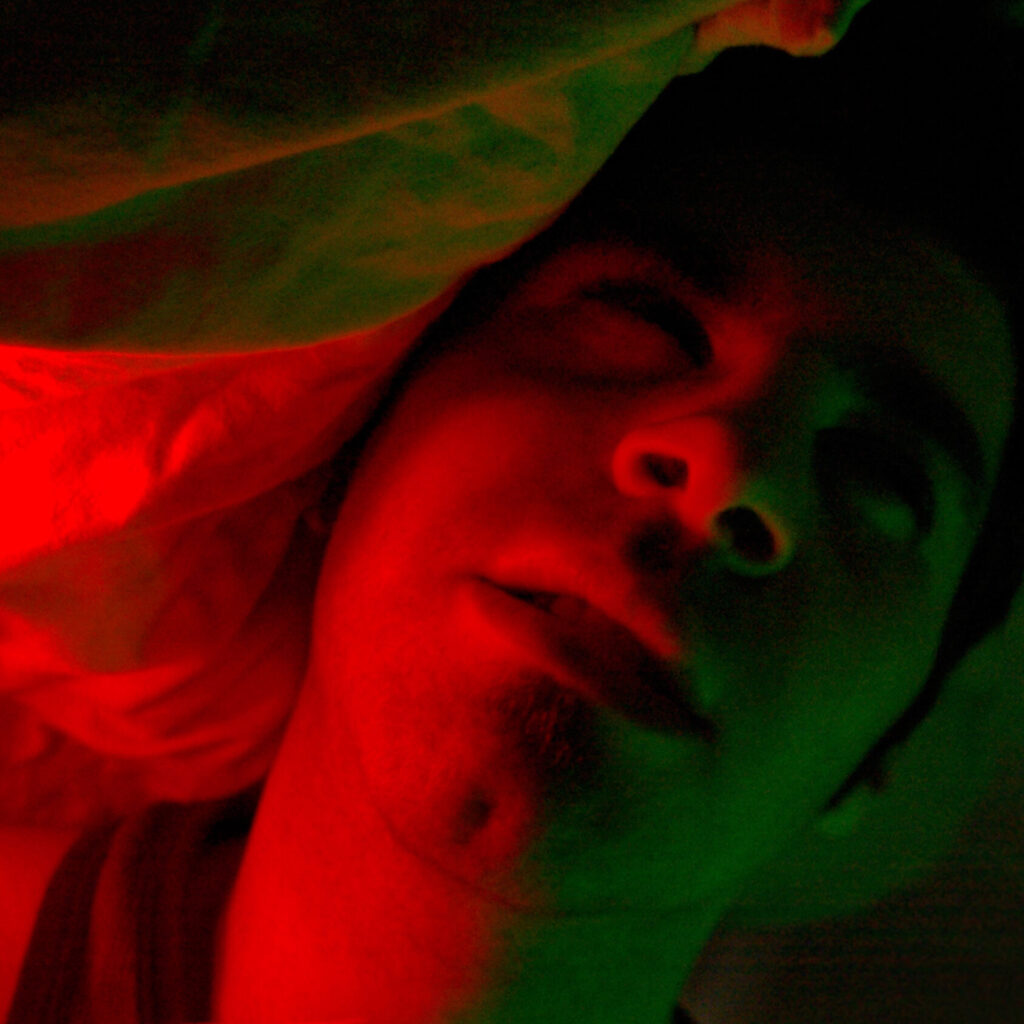 One month prior, I post mirrored nightstands, with glowing red and blue to the left, and lit windows to the right behind them, and my own maniacal face. [IG]