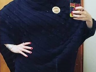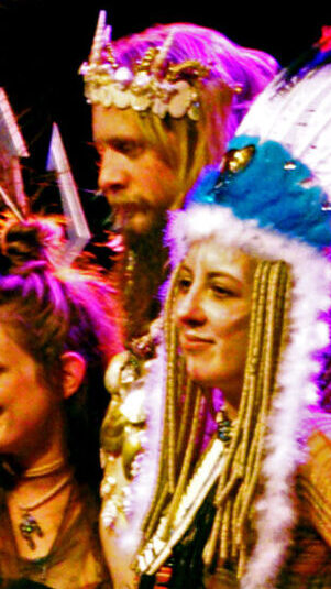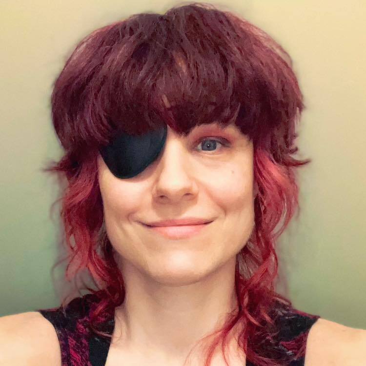 My drapey top inspires a bath theme, diagonal rain like the diagonal stripes of my top, the pointy ears and nose shape from the Blakes 7 logo, the large eyes from the 3 beside my head, the earrings and lips matching my lips, the hair curling like the hair from beneath my bike helmet. [IG]
