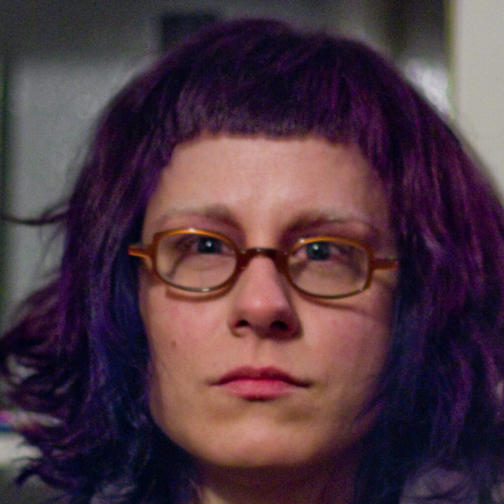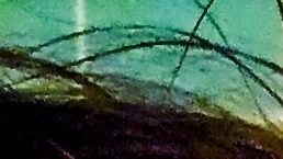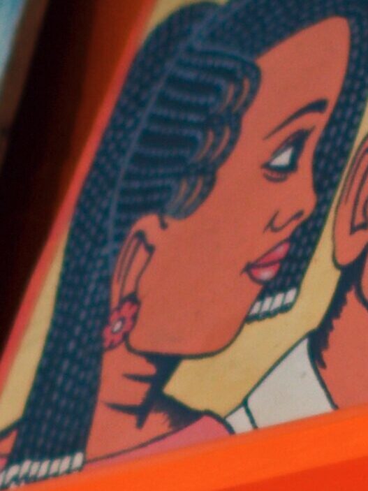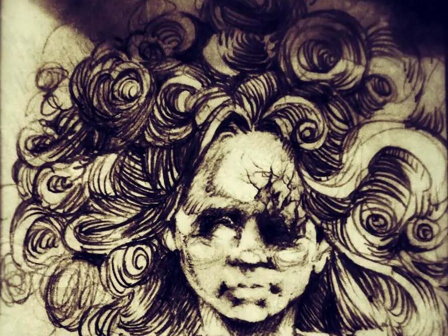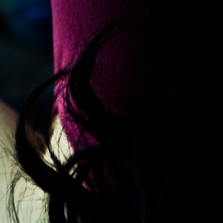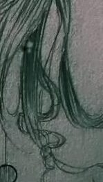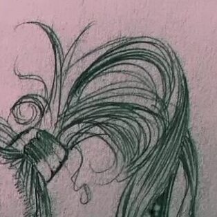 He draws Bridgette and I combined, her downturned lips, her curls on my long hair. The pens at the same angle as the power lines, the colors tweaked to match the same blue glow. [IG]
