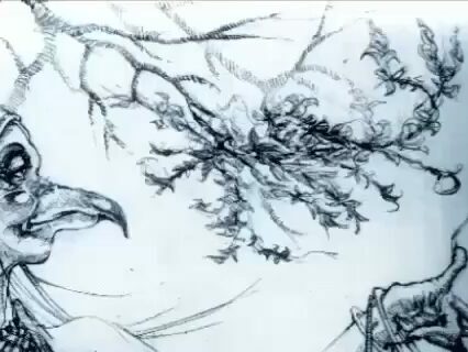 He draws a bird, the colors from the Hendrix head and WFMU logo in my video, the torn garbage bag makes the witch hat, the wound fence wire makes the pumpkin vines. [IG]