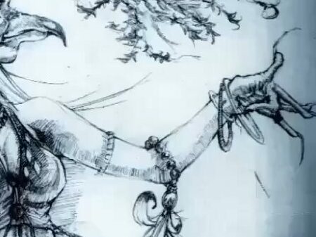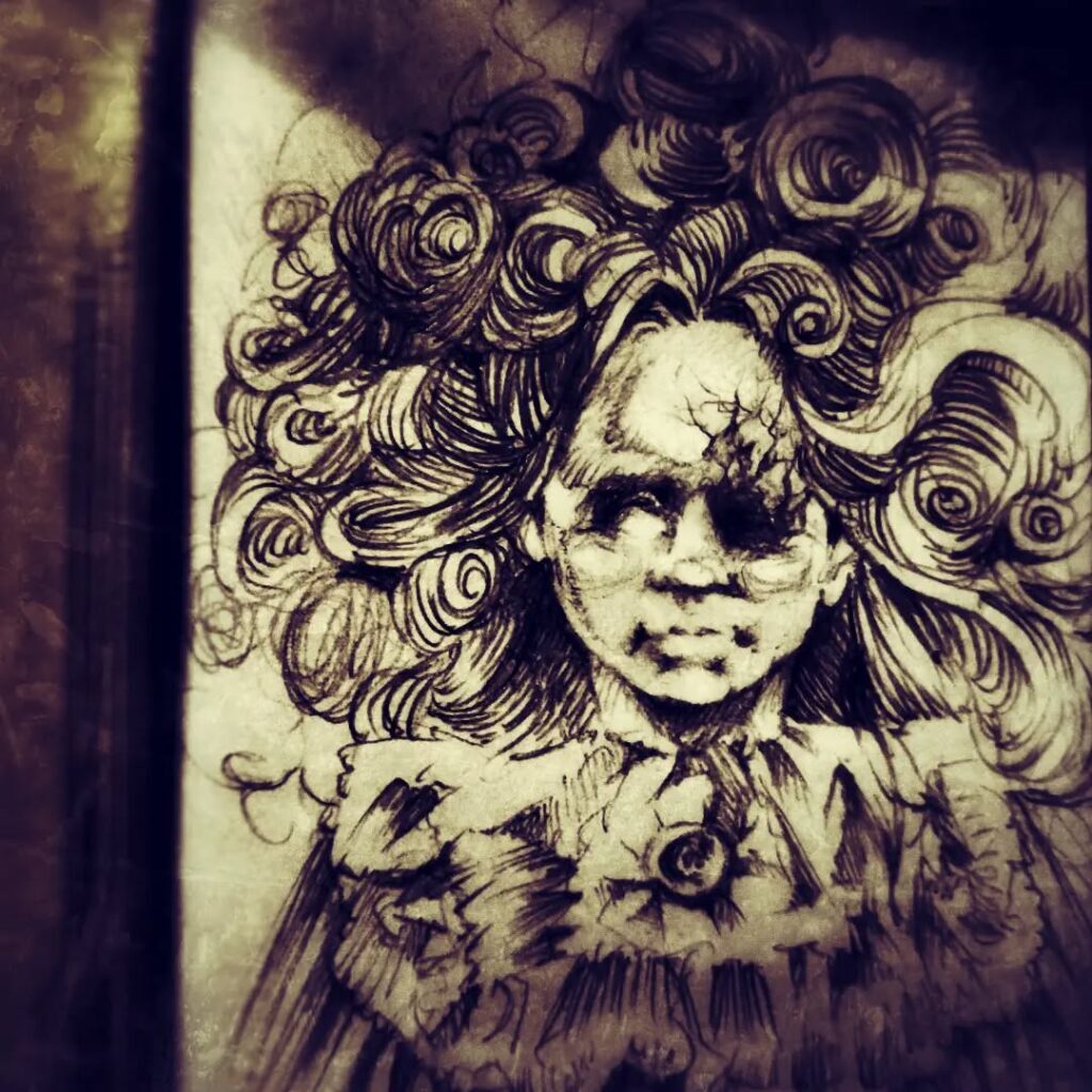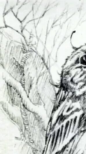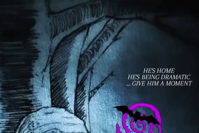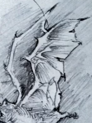 In Stefan’s drawing, phone hand becomes claw hands, columns become trees, chandelier lights becomes ghosts. [IG]