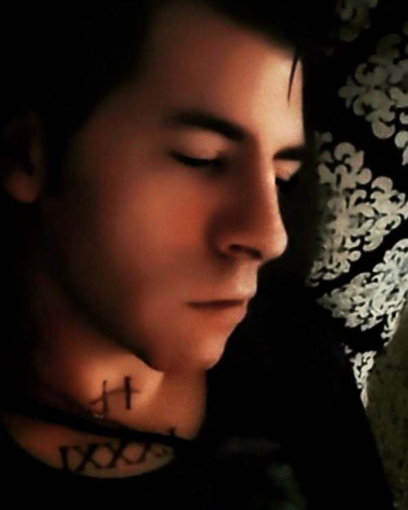 In his new photo, the trinity knot is there but partially transparent, the hand tattoos obscured, the chest tattoo hidden, the H visible. Blue and pink neon, red kiss for the red of the diner mat. [IG]