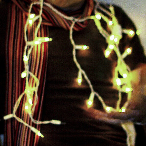 A portrait wearing Christmas lights, with the pose of my arms and the color of Milhouse’s hair and glasses. [IG]