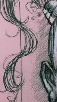 He combines them, the cinching of my flower girl dress replicated, using the blue color behind beret me for his drawing, adding glowy highlights like the neon, his pencil at a diagonal like the escalator railing. [IG]