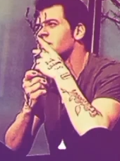 He combines them in his selfie. F for Fox over his heart, the degree circles cover the ring tattoo, the font like the ZOMBIE ANT text. The blurred blocks match the ant gif, his shoulders yellow to match the shirt. [IG]